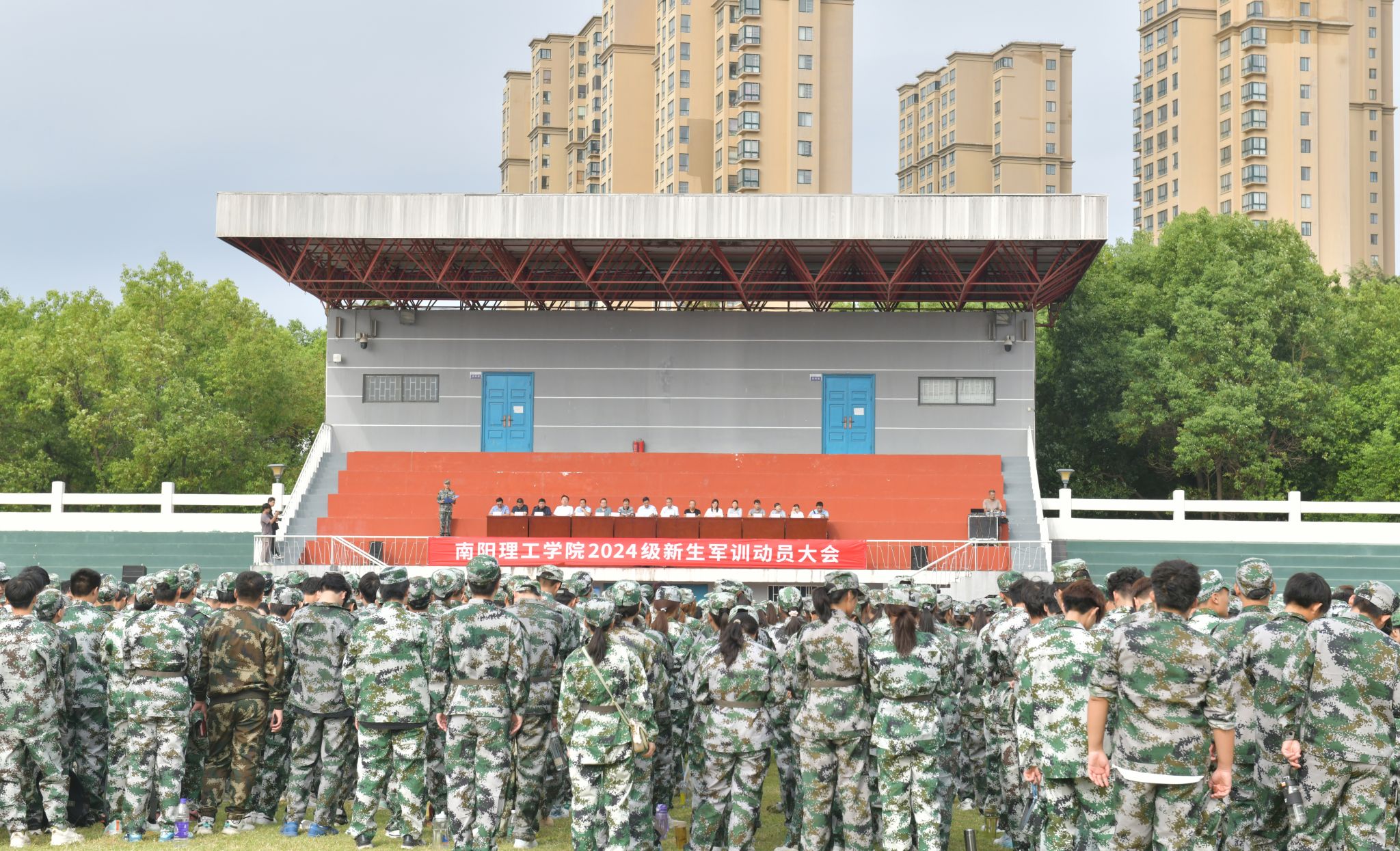 王文博)9月11日上午,我校2024级新生军训动员大会在西北校区田径场举行。校党委副书记、工会主席董豪出席并讲话,校人民武装部负责人、各教学院党委副书记、全体军训教官、2024级辅导员及5300余名新生参加动员大会。
