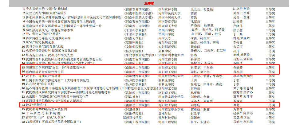 鲁静薇)近日,河南省高校校报研究会公布“2023年度河南省高校好新闻奖及新闻论文奖”主题活动获奖作品名单,我校报送的5项作品获得二等奖2项,三等奖3项。