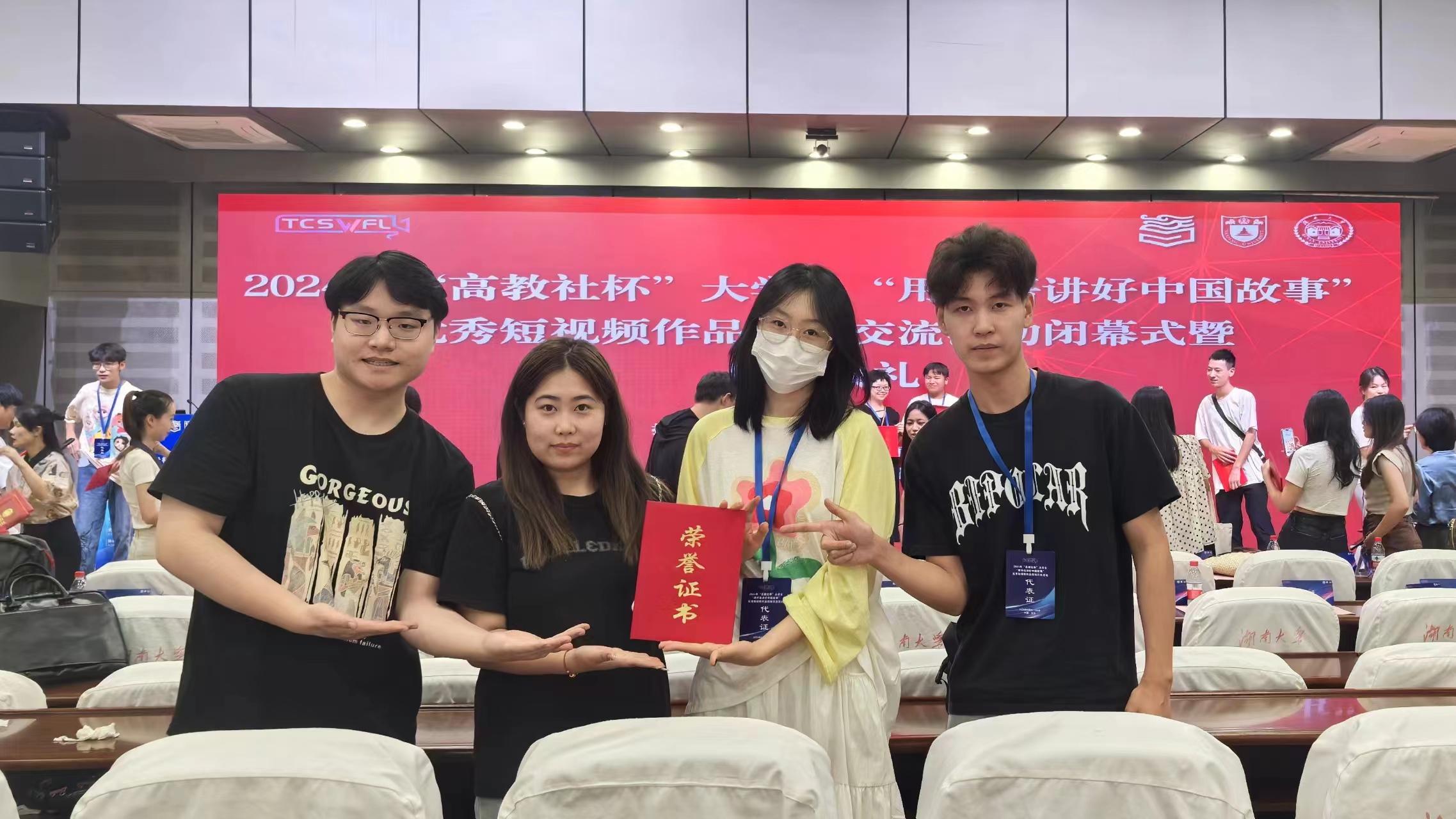 杜高洁)9月29日,由中国英汉语比较研究会指导,南京大学、湖南大学联合高等教育出版社共同举办的2024年“高教社杯”大学生“用外语讲好中国故事”优秀短视频作品征集活动决赛在湖南大学圆满落幕。由我校传媒学院魏静思老师指导,广播电视编导专业2022级学生柯霖、韩佳莉、闻振远、宋妍芸策划、拍摄、制作,2021级播音与主持艺术专业学生赵程锬配音的作品《指触未来 速度之歌》斩获全国一等奖、