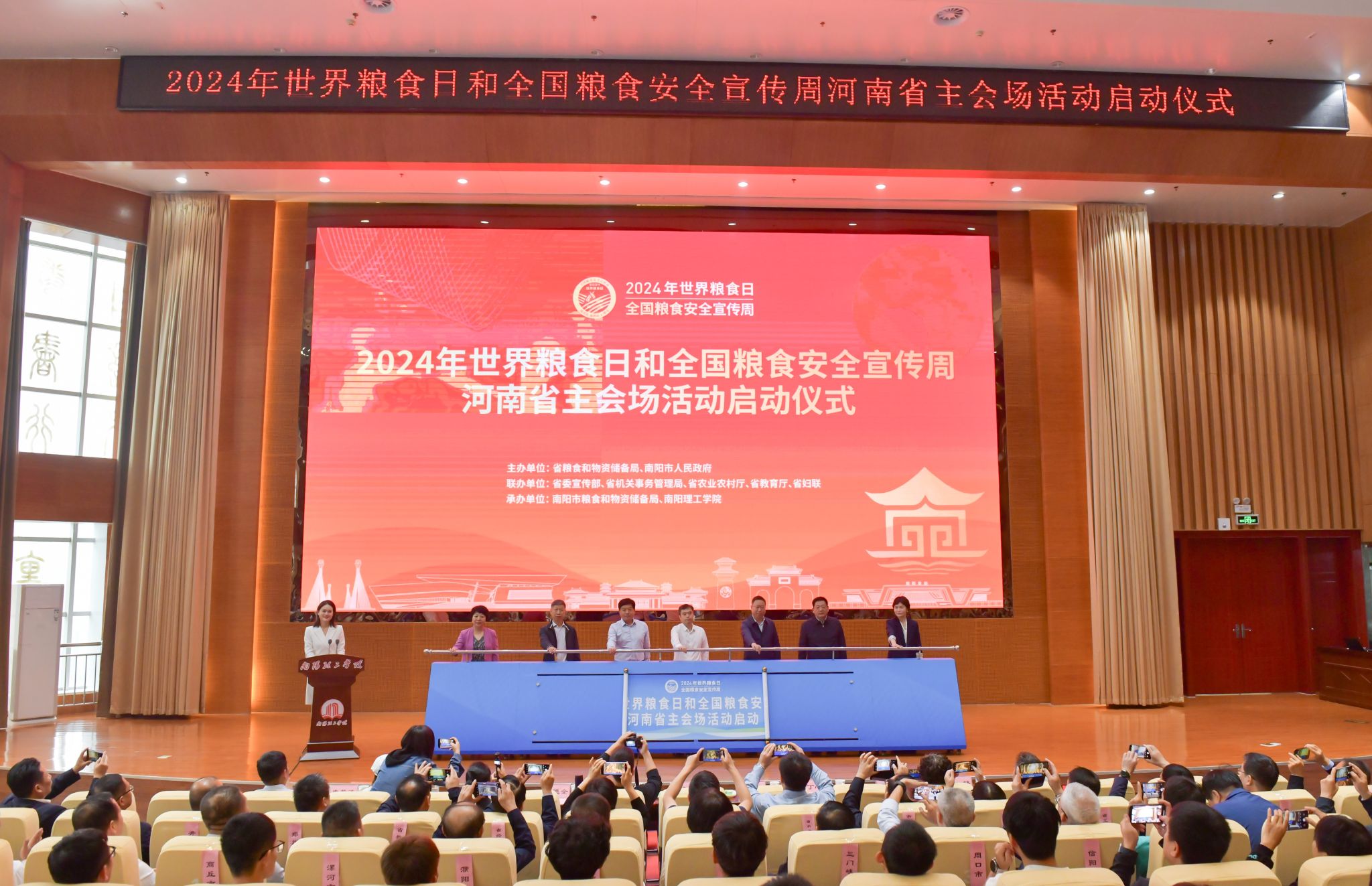 马俊)10月16日,由省粮食和储备局、南阳市人民政府主办,省委宣传部、省机关事务管理局、省农业农村厅、省教育厅、省妇联联办,南阳理工学院、南阳市粮食和物资储备局承办的2024年世界粮食日和粮食安全宣传周河南省主会场活动启动仪式在我校第三学术报告厅举行。