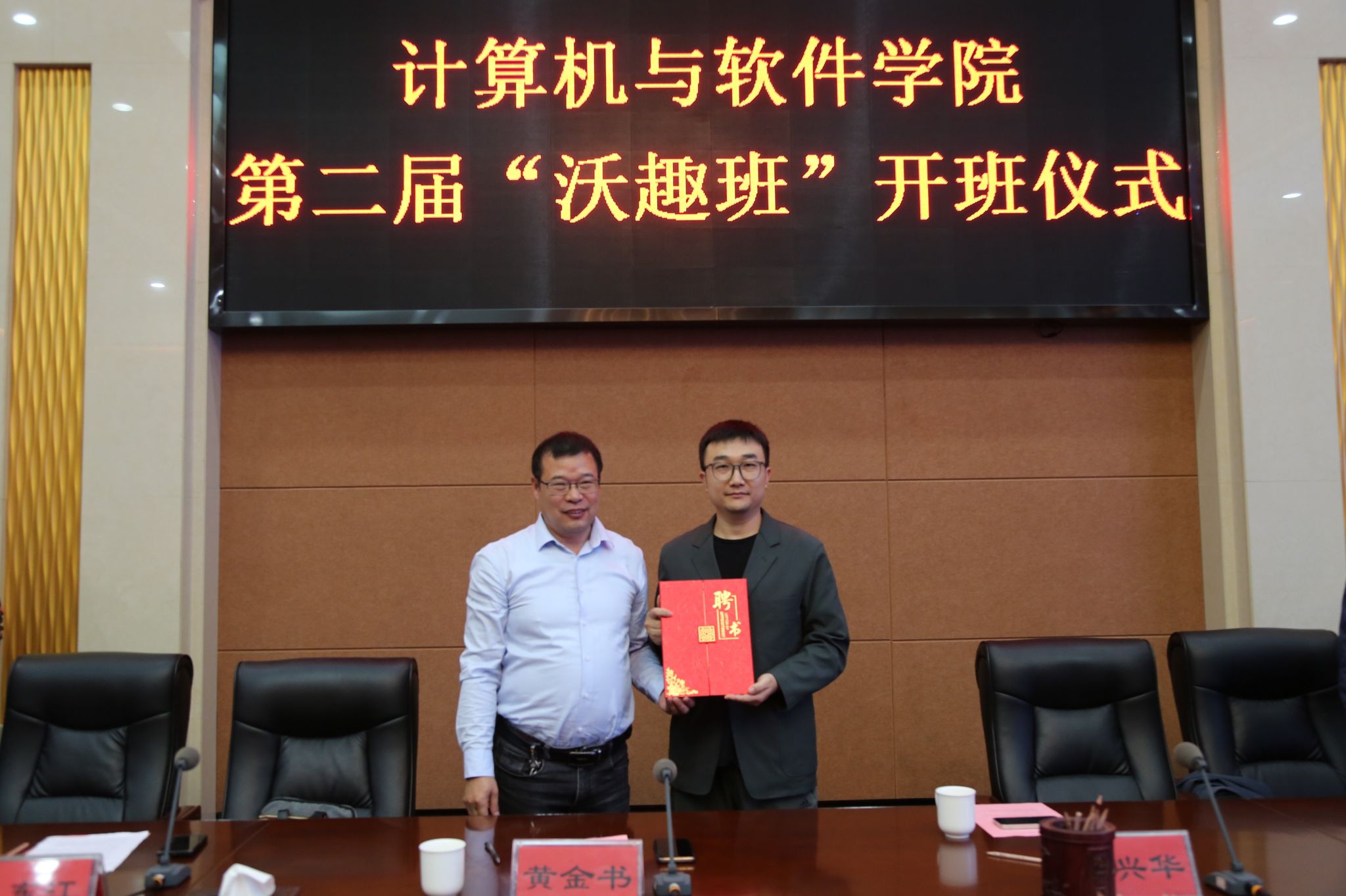 黄金书为沃趣科技CTO魏兴华先生颁发客座教授证书。