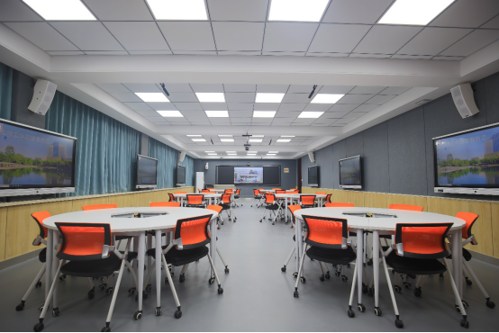 每间教室均配置录播系统,可按教师需求对课堂教学进行实时录播,能够用于学生课后复习及教师教学情境回溯;采用拼接型移动桌椅,可以快速建立研讨小组进行理论知识的研讨,也可快速提供无障碍活动空间,让该教室的学生进行全媒体交互式展示;结合移动互联技术和数据挖掘分析技术让每一位学生都能公平地参与到教师设计的教学活动中,同时也有利于活跃课堂气氛;教室安装了触摸大屏,可实现触控互动、多媒体教学和粉笔书写,将传统教学黑板和可感知的互动黑板无缝对接;每间教室安装了门禁、教室设备集中控制等系统,与学校数据中心对接,能识别上课师生权限、收集实时教学数据,全面提高教学服务及教学管理水平。