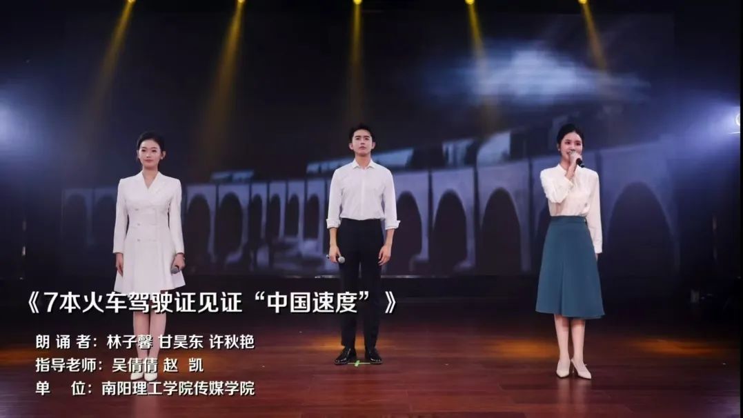 作品《7本火车驾驶证见证“中国速度”》由播音与主持艺术专业学生甘昊东、林子馨、许秋艳合诵。该作品讲述了1952年成渝铁路通车,李鸿升、李国方、李治刚祖孙三代人作为火车司机舍小家为大家的故事。三位同学通过真挚的表达,以小见大,用7本火车驾驶证见证着日新月异的中国速度和中国共产党领导下创造的历史奇迹。