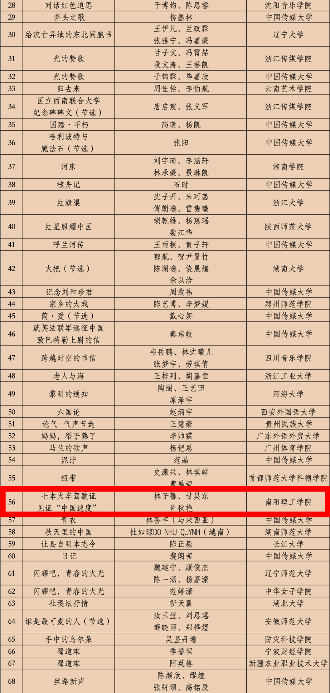 焦帅)近日,中国传媒大学公布第26届齐越朗诵艺术节暨全国大学生朗诵大会全国复选100部作品名单,我校传媒学院播音与主持艺术专业报送的作品《7本火车驾驶证见证“中国速度”》榜上有名。