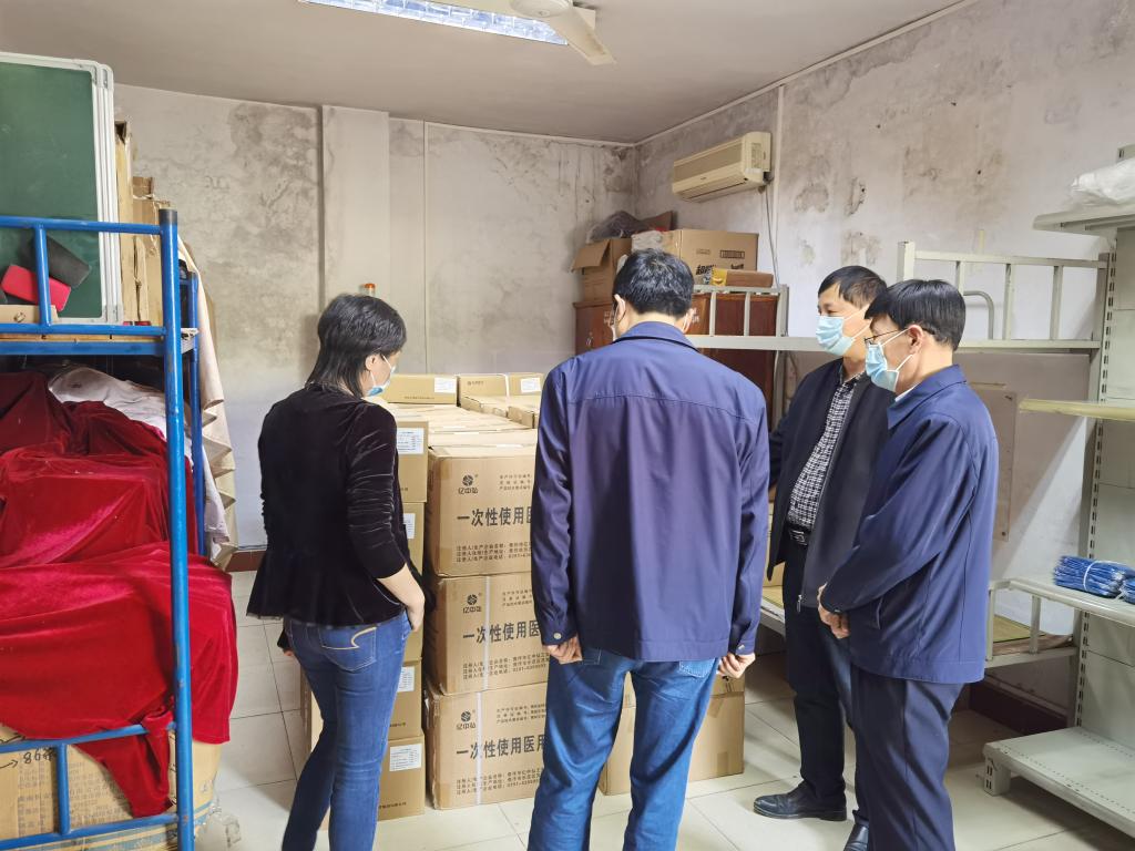 随后,督查小组一行重点检查防疫储备仓库和防疫分区。在防疫物资仓库里,督查小组随机抽查了储备的医用口罩、次氯酸和其他消毒用品。在集中隔离医学观察区和校医院发热诊室,张伟详细介绍了我校隔离区的医疗措施、生活状况以及监测隔离的方式方法和规章制度。张伟指出,我校始终严格执行上级部门各项防疫要求,消毒防护、错峰教学,全方位改善学校环境卫生条件,确保全校师生的生命安全和身体健康。