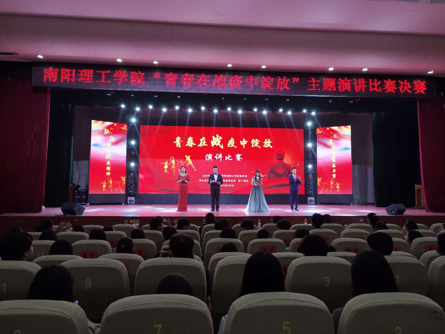 本网讯(特约记者/杨双)10月20日,由共青团南阳理工学院委员会主办,南阳理工学院学生会、校广播站承办的“青春在战疫中绽放”主题演讲比赛总决赛在毕业大厅顺利举行。校党委副书记、工会主席张伟、副校长王玉磊及部分师生代表观看比赛。