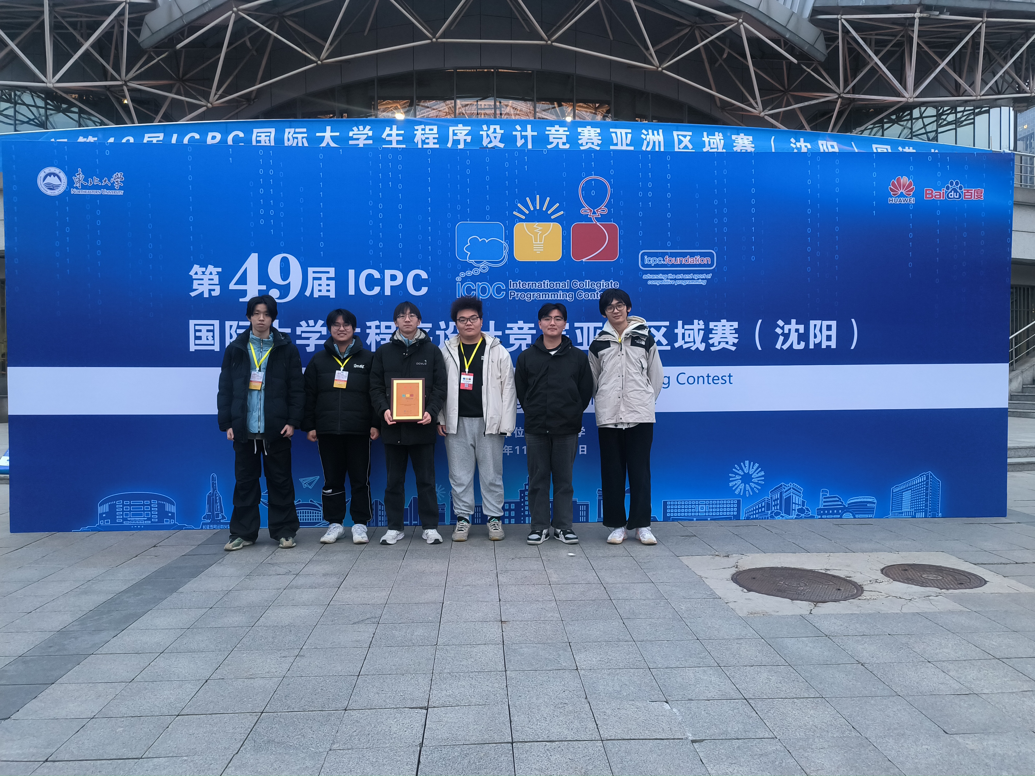 陈可)11月23日至24日,第49届ICPC国际大学生程序设计竞赛亚洲区域赛(沈阳)在东北大学举行,大赛吸引来自北京大学、浙江大学、上海交通大学等200多所高校的320支队伍同场竞技。我校计算机与软件学院派出的李灿辉、禹云龙、张泽楷三位同学组成的代表队,凭借出色的表现,荣获铜牌一枚。