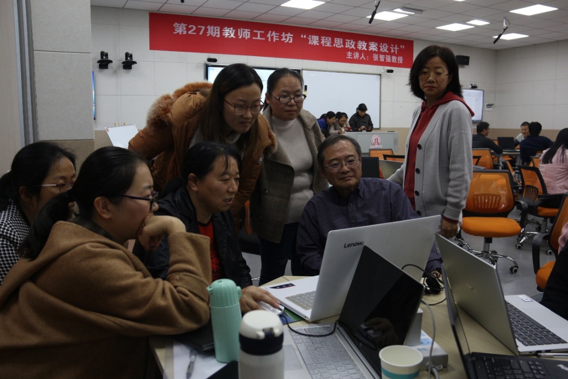 实践操作环节,参加培训教师根据自己承担课程分小组进行教案设计,张智强深入各组与教师亲切交流,答疑释惑,启发指导。