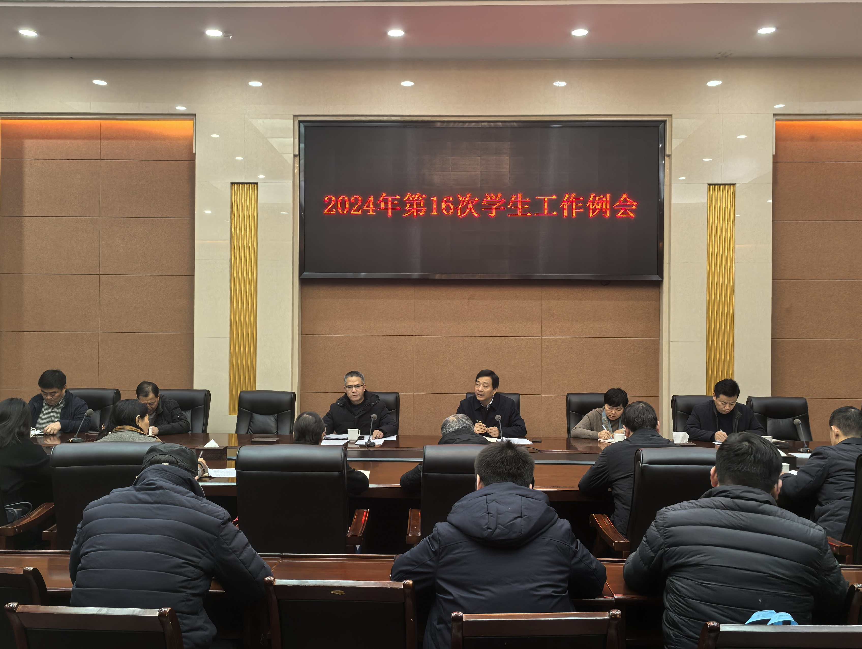 王吉春)12月4日下午,我校召开2024年度第16次学生工作例会,校党委副书记、工会主席董豪主持会议。学生处、团委、心理健康教育中心、保卫处、后勤服务中心、校医院等部门主要负责人,各教学院党委副书记、学工办主任参加会议。
