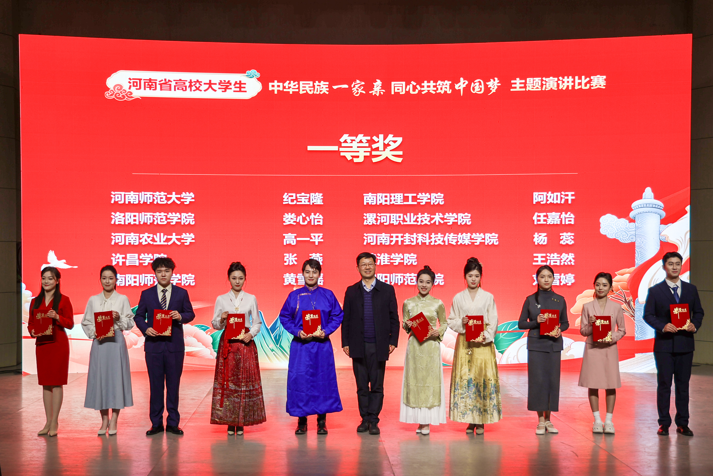 马丹)12月4日,由中共河南省委教育工委、省教育厅主办,河南师范大学承办的全省高校大学生“中华民族一家亲,同心共筑中国梦”主题演讲比赛决赛在河南师范大学举行。我校传媒学院学生阿如汗凭借扎实的专业功底和出色的舞台表现脱颖而出,斩获一等奖。