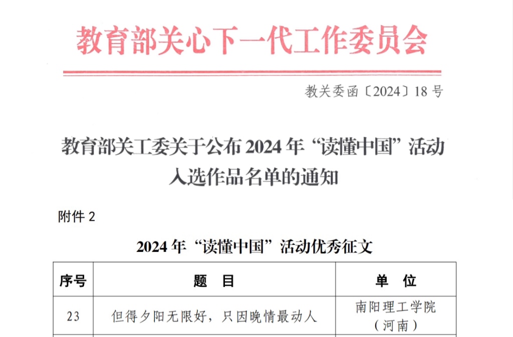 黄晨)近日,我校在教育部举办的2024年“读懂中国”活动中获优秀征文1项,在省教育厅举办的高校“读懂中国”活动中,参赛的五个作品全部获奖,其中特等奖3项、一等奖2项。