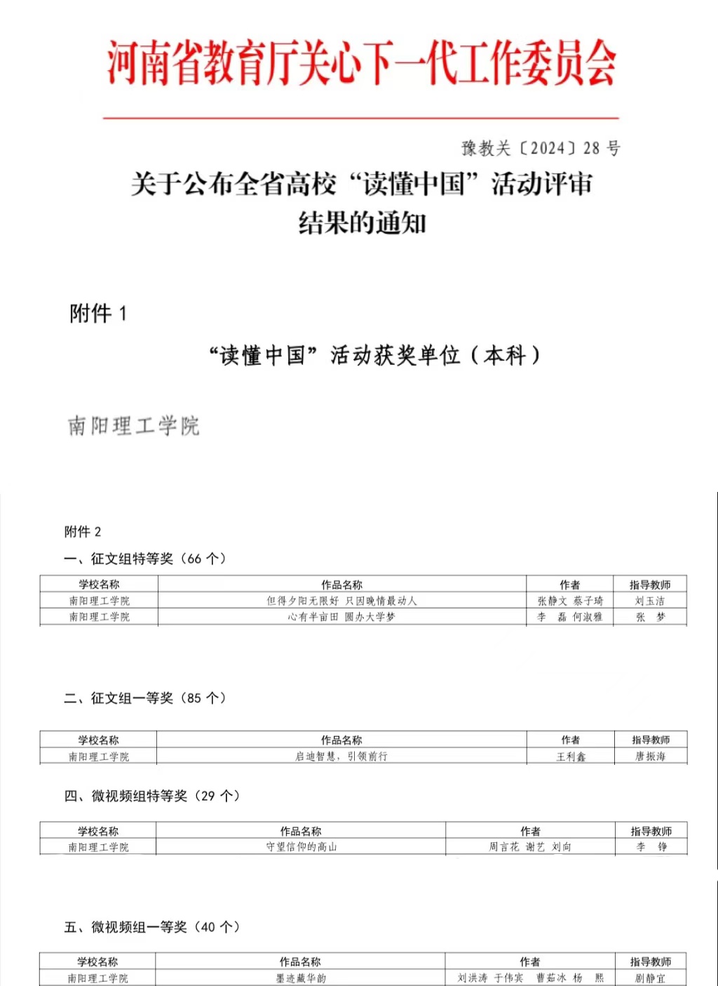 生物与化学工程学院选送的《但得夕阳无限好 只因晚情最动人》分别获教育部关工委优秀征文奖、省教育厅关工委征文特等奖,《心有半亩田 圆办大学梦》获省特等奖;数字媒体与艺术设计学院选送的《启迪智慧,引领前行》获一等奖,传媒学院选送的微视频作品《守望信仰的高山》、《墨迹藏华韵》分别获特等奖和一等奖。