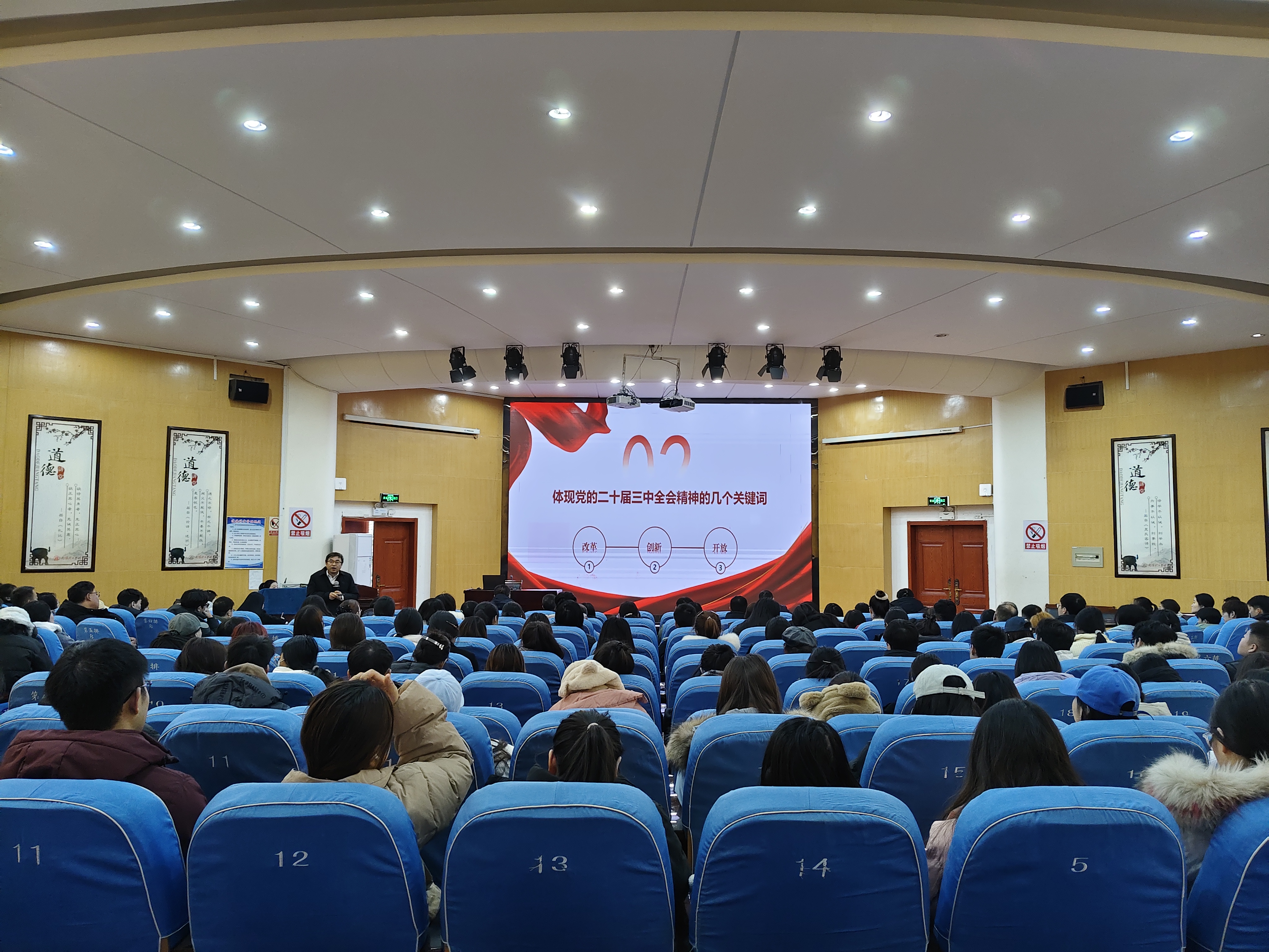 安士伟以《学习党的二十届三中全会精神》为题,从党的二十届三中全会的重大意义入手,以改革、创新、开放为关键词,对党的二十届三中全会精神展开细致讲解,既回溯了历史发展脉络,又剖析了未来发展方向。他强调,要坚持以深化教育综合改革为目标,全面发力、多点突破、纵深发展,充分发挥高等教育龙头作用,对接地方经济发展需要,促进科技成果转化和应用,培养更多具有创新精神和实践能力的人才,为国家现代化建设贡献力量。