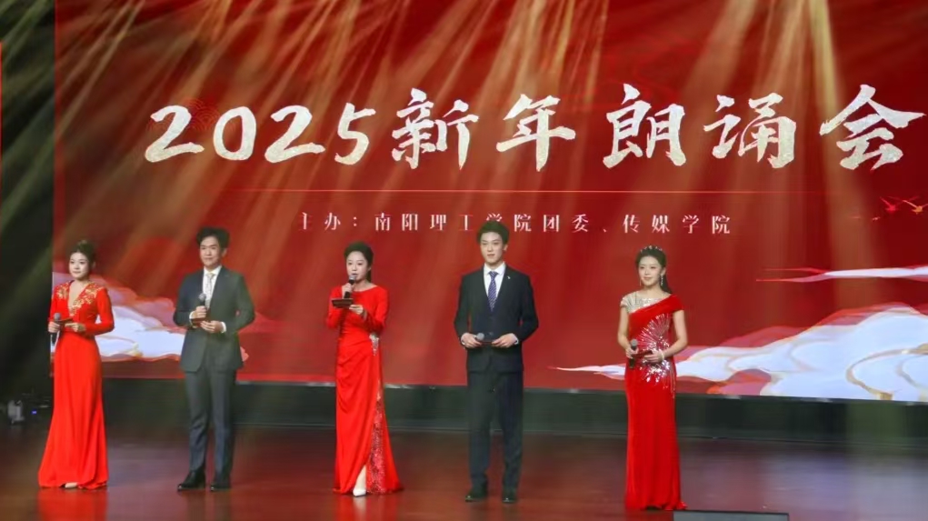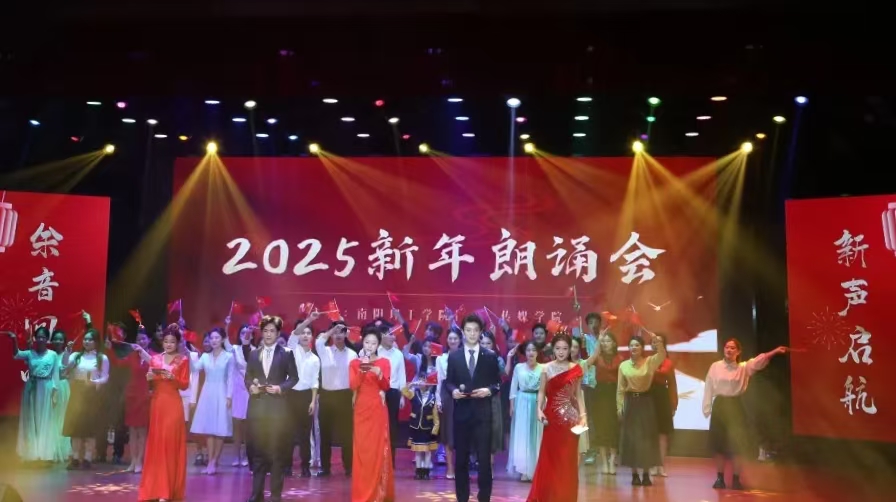 吴倩倩)12月24日晚,由南阳理工学院团委、传媒学院主办的“余音回响,新声启航”2025新年朗诵会在东校区21教演播厅举行。校党委副书记张爱红、副校长高芳放,南阳市文联党组书记、主席雷洪波,南阳市作家协会副主席水兵,南阳大剧院董事长曹一鸣、总经理刘九牛等,以及校团委、传媒学院领导班子和师生欢聚一堂,聆听经典,迎接新年。