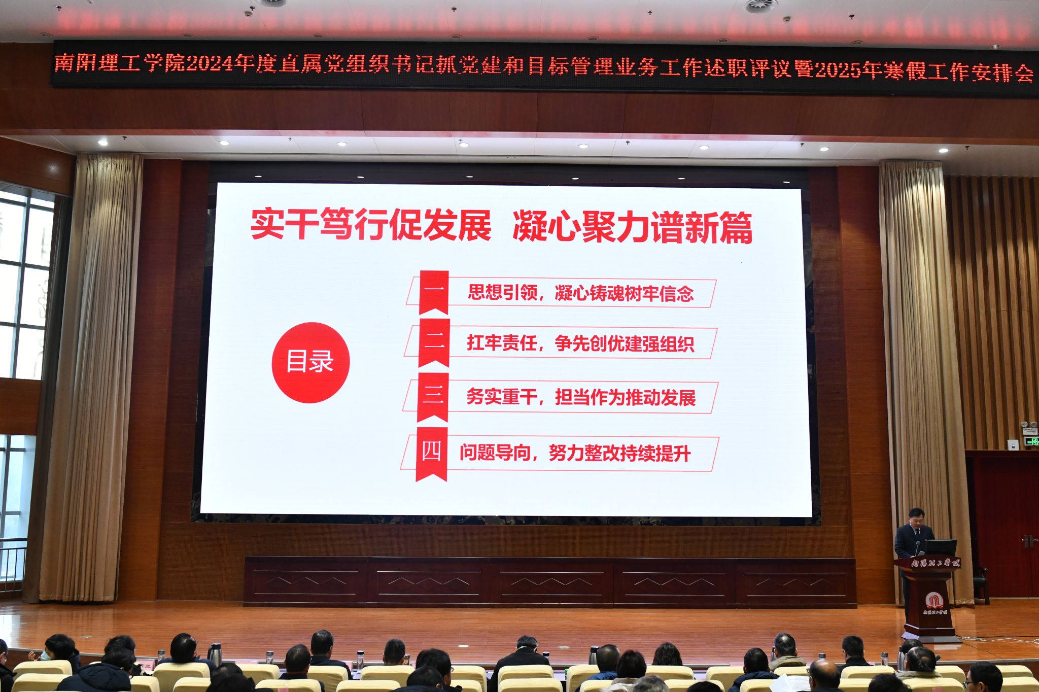 本网讯 1月13日,学校在第三报告厅召开南阳理工学院2024年度直属党组织书记抓党建和目标管理任务工作述职评议暨2025年寒假工作安排会。校党委书记安士伟逐一点评,校长郝好山安排寒假工作,校领导张爱红、董豪、于继武、葛晨光、蔡广宇、高芳放、黄金书出席,全体中层干部参加。