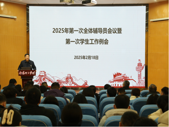 王吉春)2月18日上午,我校2025年第一次全体辅导员会议暨第一次学生工作例会在第二学术报告厅召开。校党委副书记、工会主席董豪出席会议,学生处、团委、心理健康教育中心、保卫处、后勤服务中心、校医院、依法治校办公室等部门主要负责人,全体辅导员参加会议。