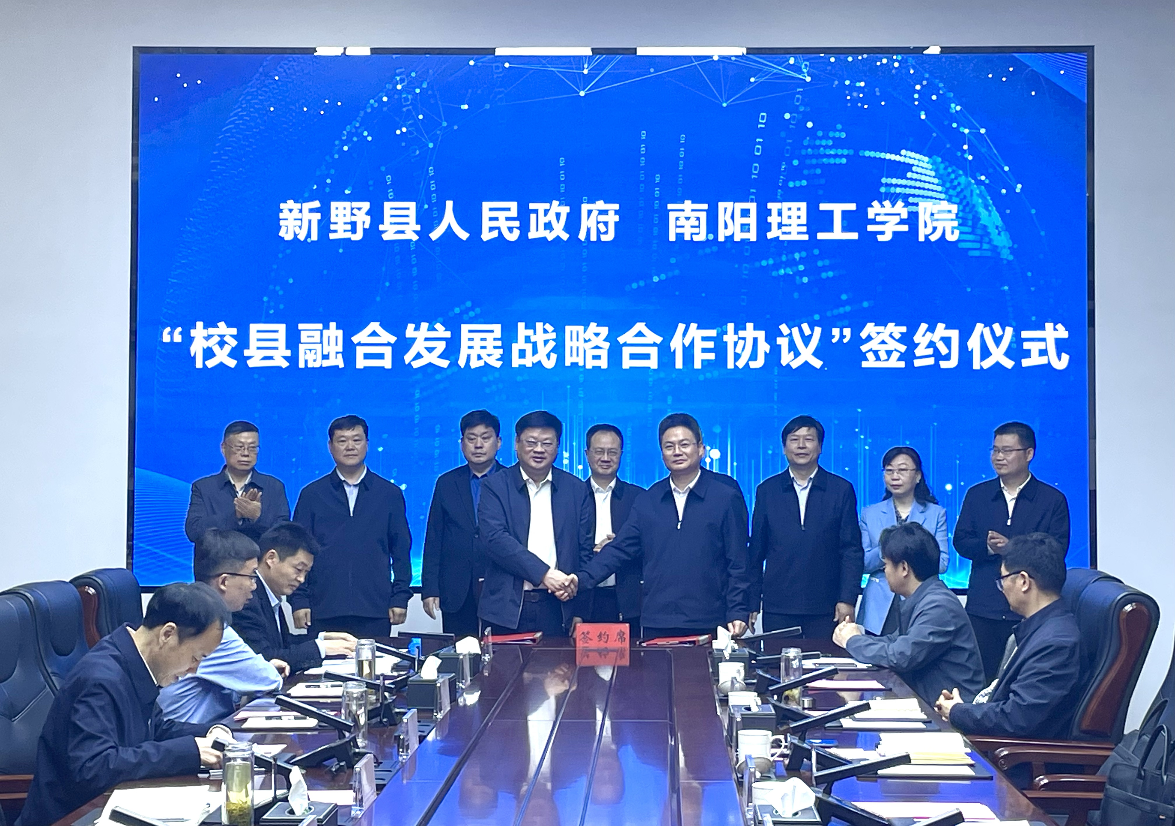 符浩彬 腾冰冰)3月26日上午,南阳理工学院与新野县人民政府举行“校县融合发展战略协议”签约仪式,校县双方将共建科技创新服务中心,打造技术研发、成果转化、企业孵化一体化平台,完善协同创新体系,共同推动新野县引进高端人才、集聚创新资源、优化产业结构,为区域高质量发展注入可持续动能。校长郝好山、新野县政府县长李文鹏代表校县双方签约。