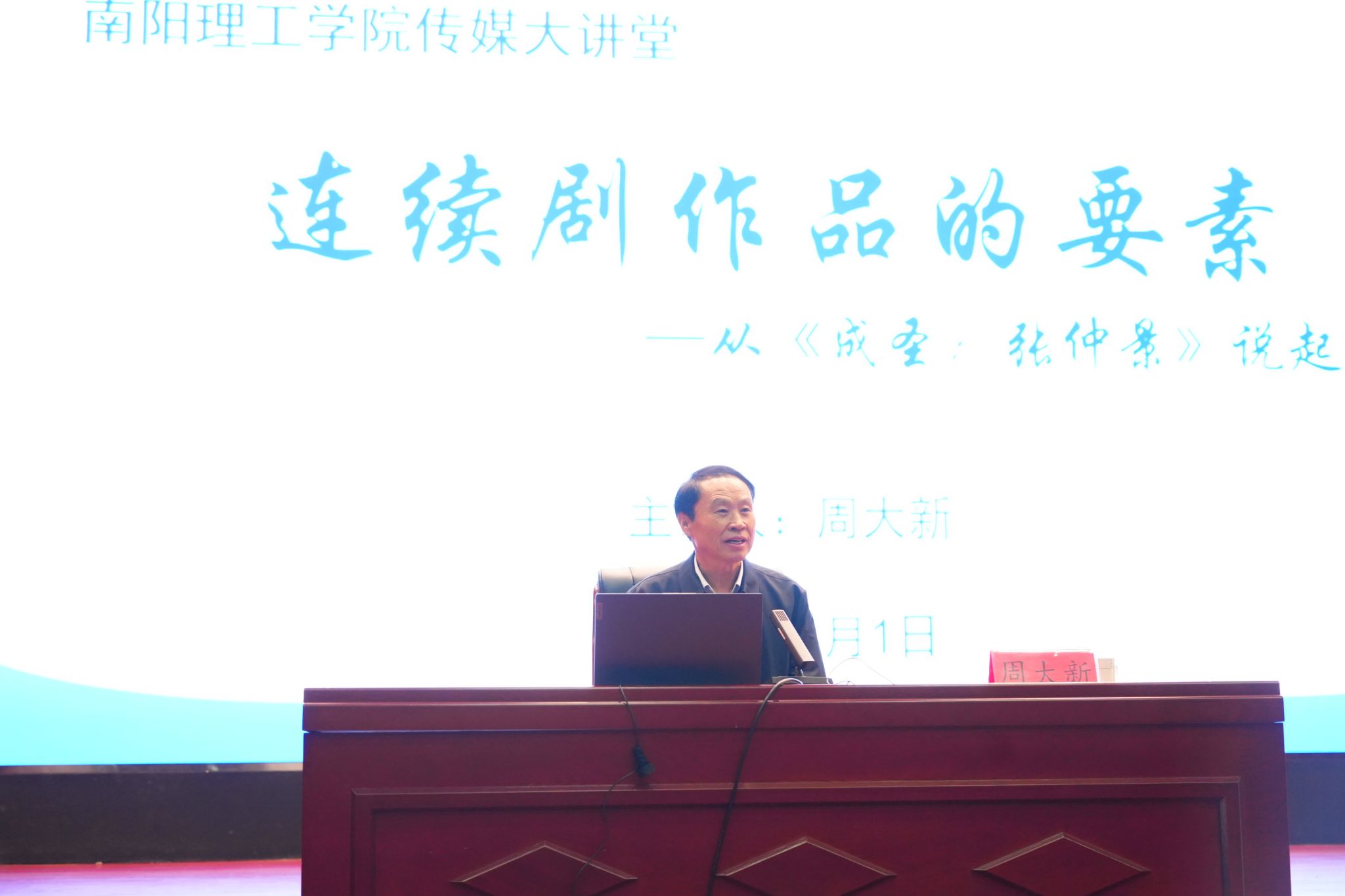 钟慧媛 张旭东)4月1日下午,茅盾文学奖获奖作家周大新应邀来校,在东校区音乐厅作《连续剧作品的要素——从〈成圣:张仲景〉说起”》讲座。校长郝好山、校党委副书记张爱红,南阳市文联相关领导和传媒学院师生600余人聆听讲座。