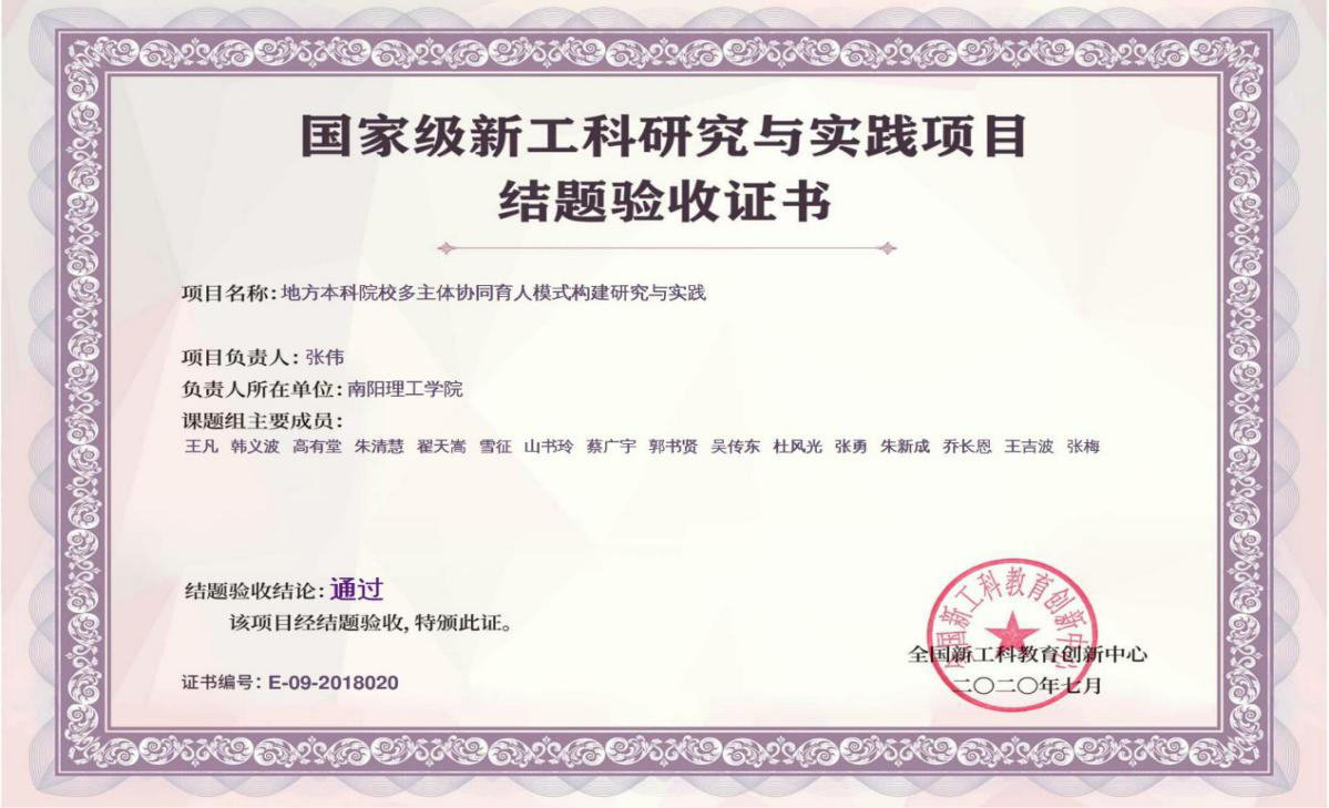 张伟教授主持的教育部首批新工科研究与实践项目《地方本科院校多主体协同育人模式构建研究与实践》于2020年7月份顺利通过验收。下一步,我校将继续在精准把握新工科建设内涵、主动布局适应国家战略发展需求的新工科专业基础上,提高工科专业建设整体水平,积极推动新工科研究与实践项目建设,提高工科专业建设整体水平,提升学校应用型人才培养质量,加快推进特色鲜明的高水平应用型理工大学建设。