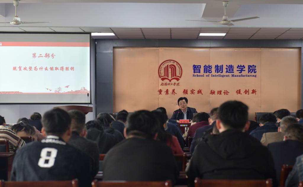 本网讯(特约记者/刘煜)4月6日下午,党委副书记秦鹏鸣为智能制造学院师生开展“弘扬脱贫攻坚精神 勇担民族复兴重任”专题党课。智能制造学院领导班子、全体教职工及学生党员代表参加。