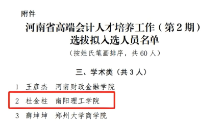 韩正)近日,河南省财政厅正式公布河南省高端会计人才培养工作(第2期)选拔拟入选人员名单,全省共计60人入选,其中企业类31人、行政事业类19人、注册会计师类7人、学术类3人。我校范蠡商学院杜金柱凭借其扎实的专业功底、突出的科研能力与社会影响力,入选学术类人才,成为全省入选的三位学术类代表之一,也是南阳地区唯一入选高校教师。
