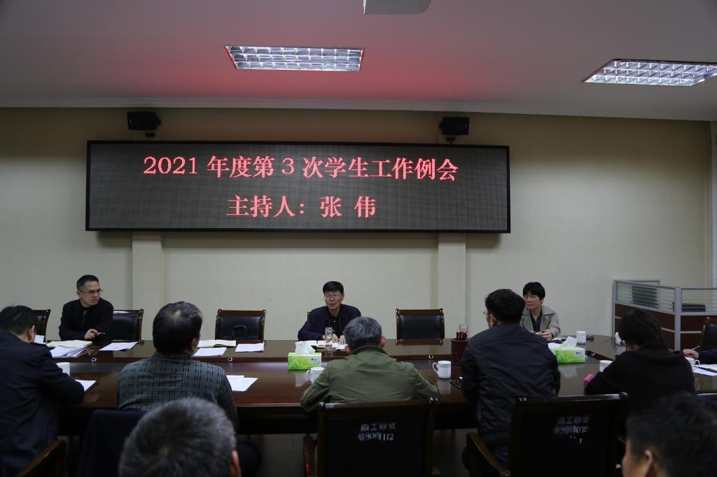 本网讯(特约记者/张启鑫)4月19日下午,校党委副书记、工会主席张伟主持召开我校2021年度第3次学生工作例会。学生处、保卫处、团委、心理健康教育中心、后勤服务中心、校医院等部门主要负责人,各教学院党委书记参加会议。