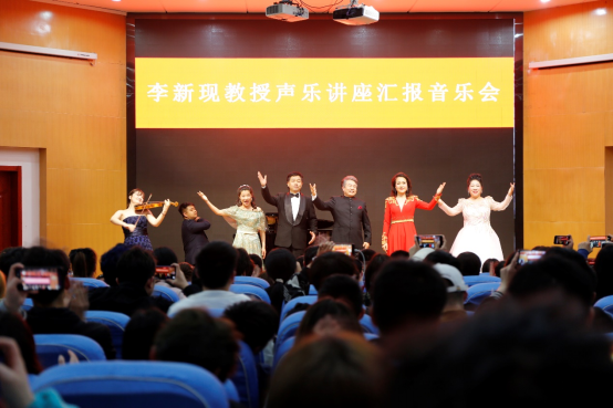 当晚,李新现和教师教育学院张宁、别志安、王雨、陈婷婷四位教师举办汇报音乐会。教师们分别演唱《妈妈》、《在那遥远的地方》、《一首桃花》等歌曲,获得现场观众阵阵喝彩。最后,李新现和学院四位教师一起演唱《我爱你,中国》,为建党100周年献礼。高亢的歌声飘荡在整个大厅,激发了师生们强烈的爱国热情。