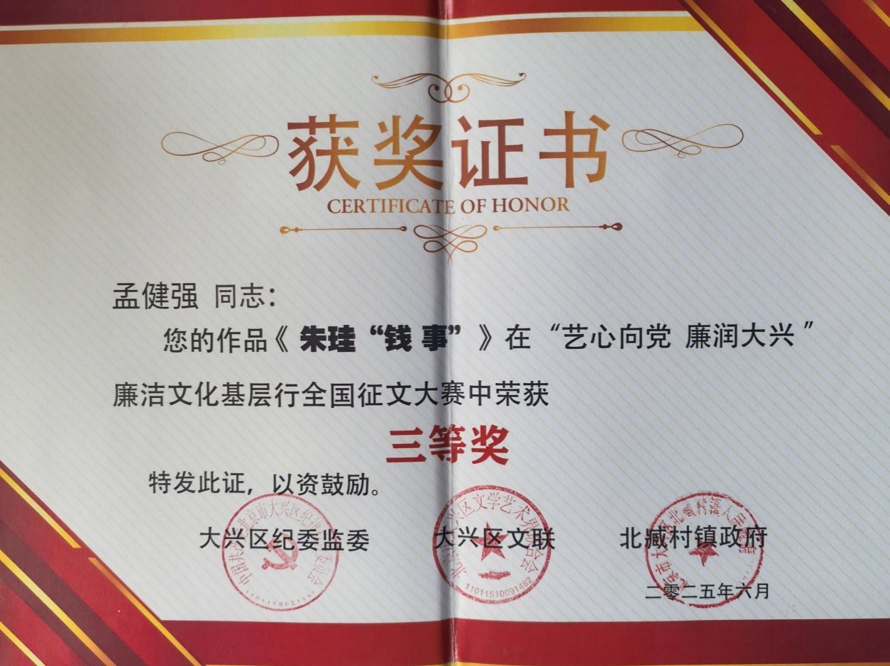 由北京市大兴区纪委监委联合多部门主办的“艺心向党 廉润大兴”廉洁文化基层行主题征文活动中荣获三等奖。