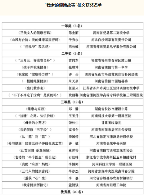 张芳)近期,由河南省卫生健康委员会宣传处指导,河南省健康中原服务保障中心与医药卫生报社联合主办的“我家的健康故事”全国征文活动评选结果揭晓,我校孟健强老师的作品《我家健康历险记》荣获三等奖。