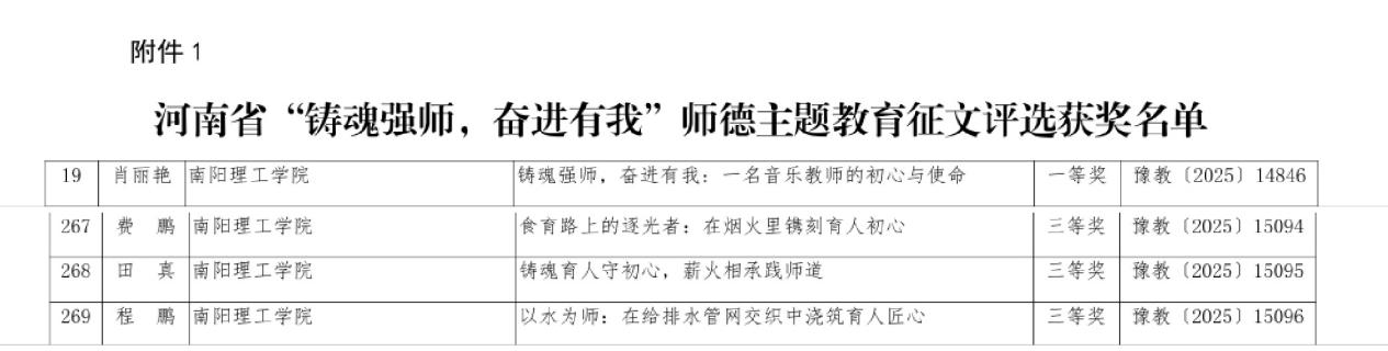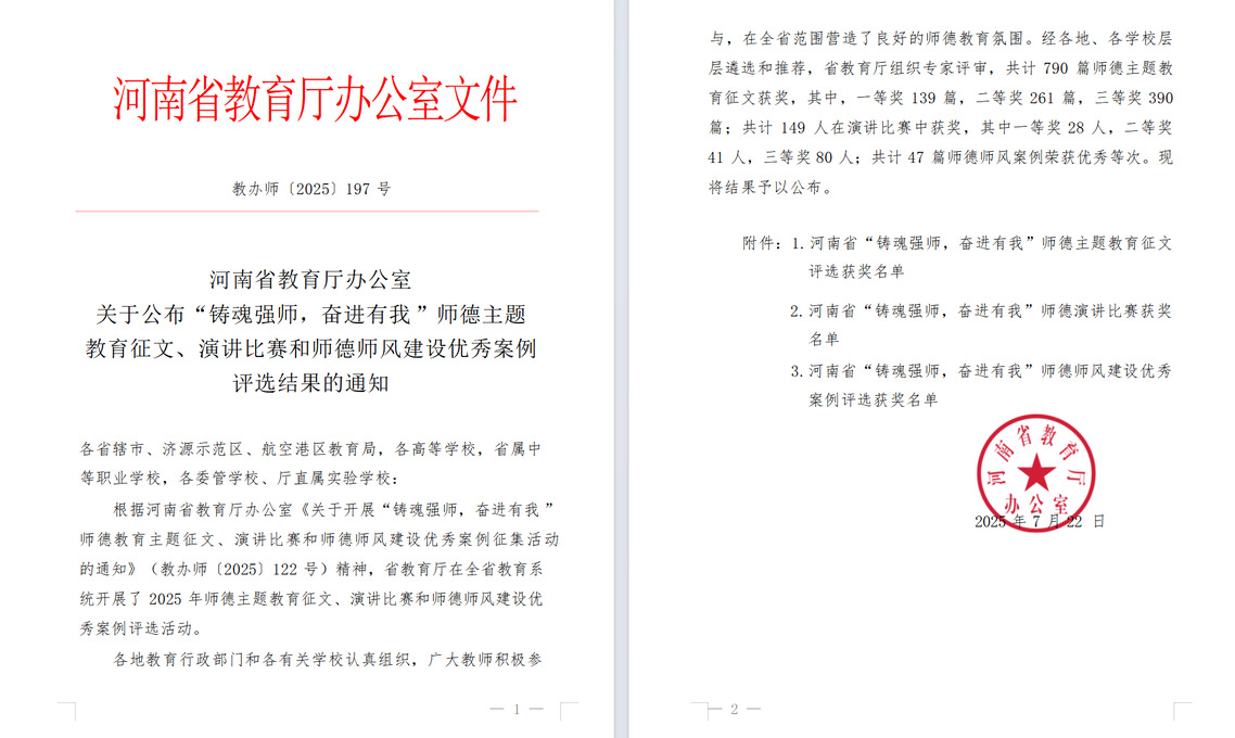 韦地) 近日,河南省教育厅下发《关于公布“铸魂强师,奋进有我”师德主题教育征文、演讲比赛和师德师风建设优秀案例评选结果的通知》(教办师〔2025〕122号),我校多位教师在此次评选中喜获佳绩。
