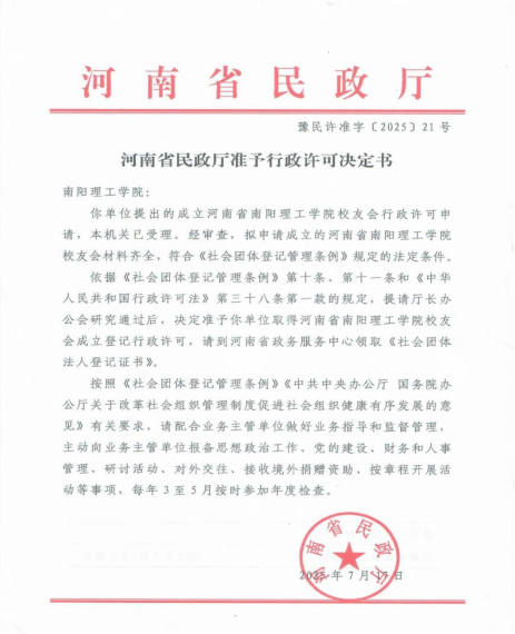 /王金)7月29日,我校领取河南省民政厅下发的河南省南阳理工学院校友会成立行政许可决定书及社会团体法人登记证书,标志着我校校友会正式获得上级批准。校友会的正式获批既是全校师生与历届校友的共同心愿,也是学校校友工作发展的重要里程碑。