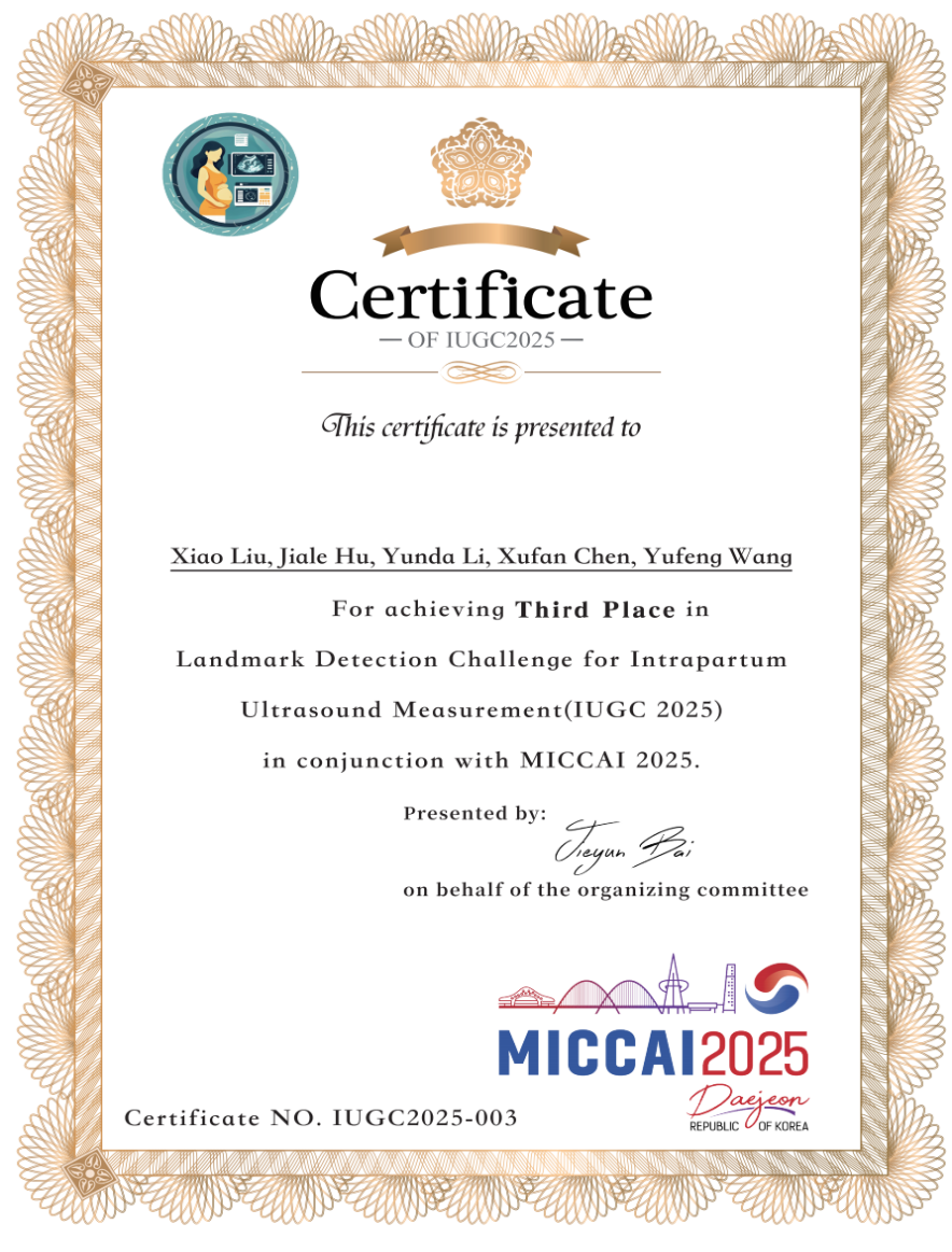 王豫峰)9月23日,国际医学影像领域顶会MICCAI(Medical Image Computing and Computer Assisted Intervention)在韩国举办。我校电子信息学科研究院智能计算研究所的王豫峰博士所带领的DL-ICG团队2022级软件工程专业刘肖、胡家乐、李运达和陈许帆同学,在会议发起的分娩胎儿超声关键点检测挑战赛(IUGC),从来自全球知名科研机构和企业的多支参赛队伍中脱颖而出,荣获全球第三名佳绩。