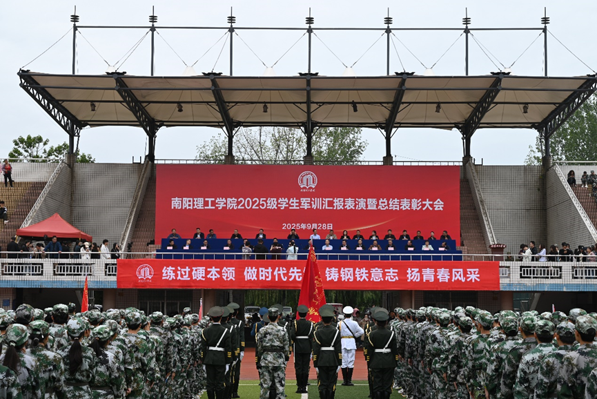 高芳放宣读《南阳理工学院关于表彰2025级新生军训先进单位和个人的决定》,校领导为获奖先进集体和个人代表颁奖。