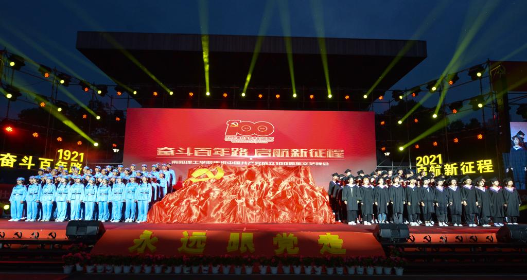 雄壮激昂的大合唱《没有共产党就没有新中国》,拉开了南阳理工学院庆祝中国共产党成立100周年文艺晚会帷幕。作为学校党史学习教育和庆祝建党一百周年系列活动的重要组成部分,晚会以中国共产党的一百年光辉发展历程为主线,分为“开天辟地救中国、改天换地兴中国、翻天覆地富中国、惊天动地强中国”四个篇章。中国共产党波澜壮阔的一百年征程,以磅礴的气势,浓墨重彩地再现在师生的面前;党旗飘飘,党徽璨璨,中国共产党人可歌可泣的奋斗历史,浓缩在两个小时的华彩乐章中。