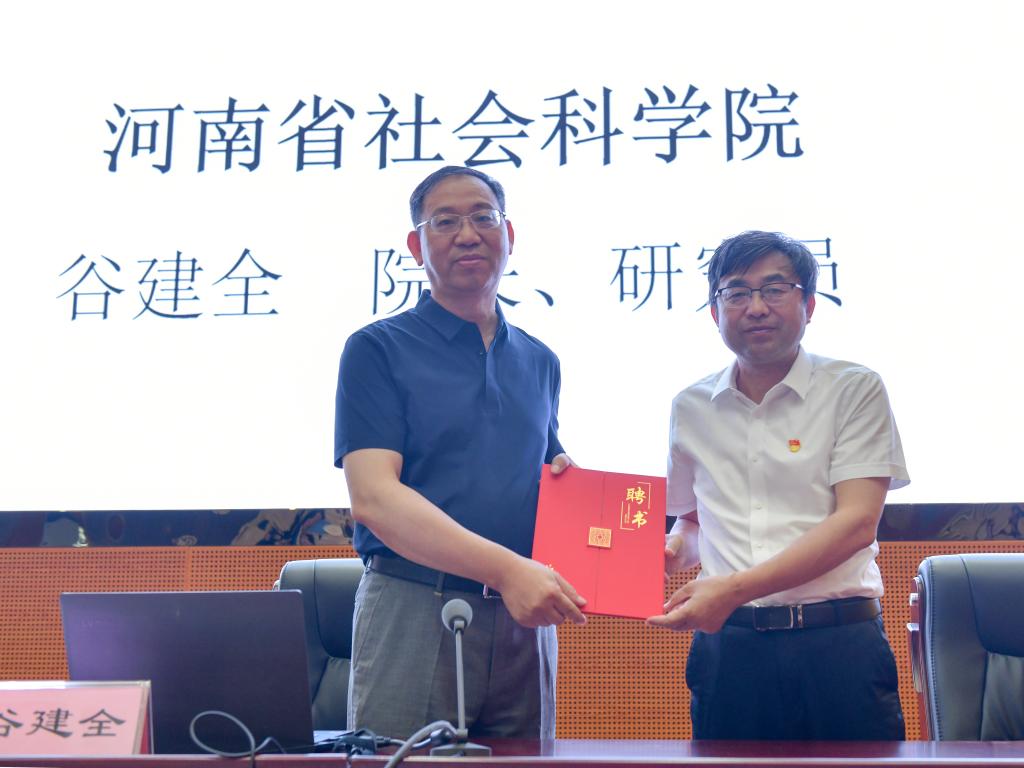 本网讯(特约记者/李浩)7月1日,河南省社会科学院院长谷建全研究员来校讲学。全体在家校领导出席报告会,校长安士伟为谷建全颁发首席专家证书,副校长肖泽昌主持会议。