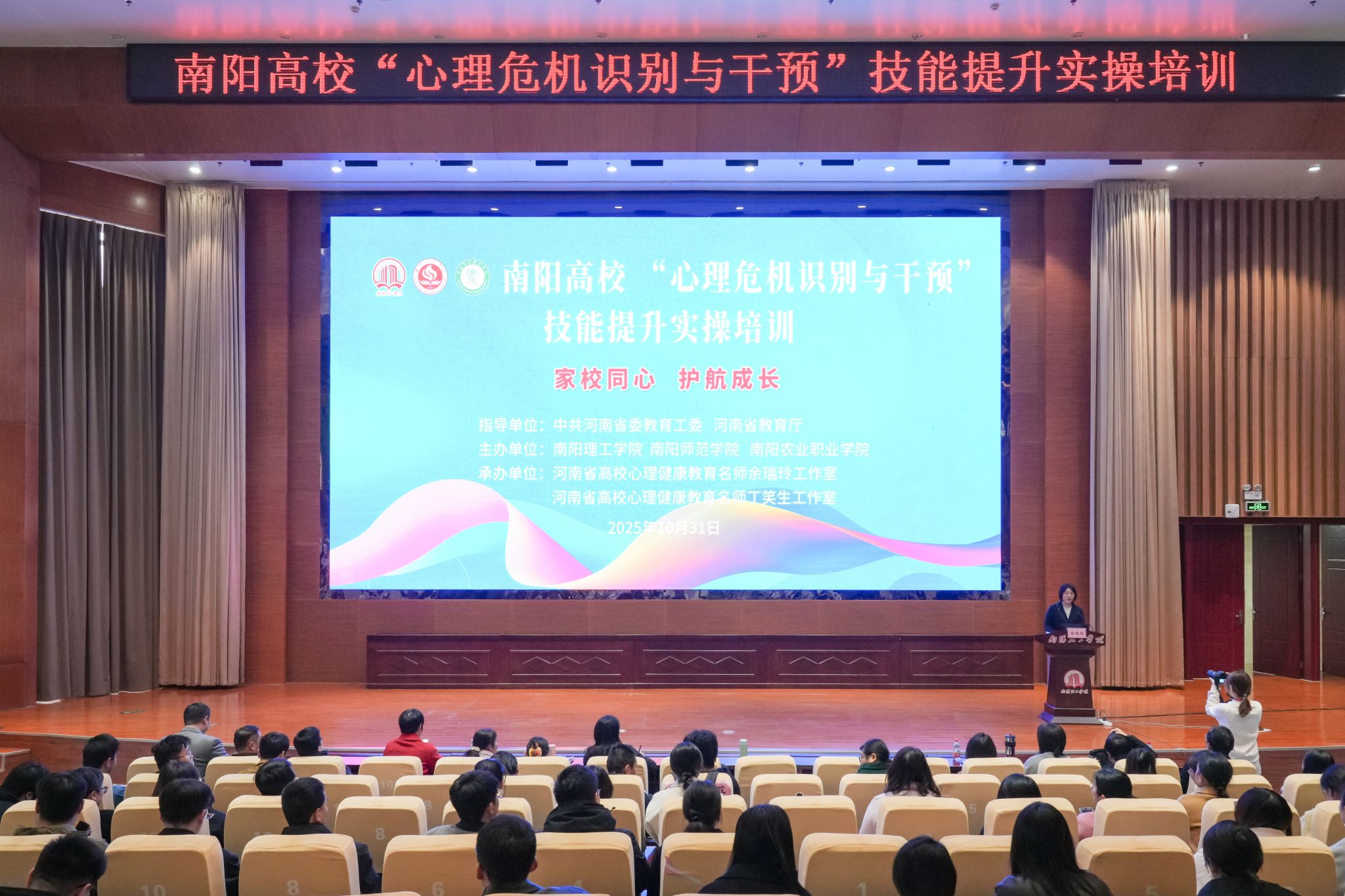 /孟凡锐)10月31日,由南阳理工学院、南阳师范学院、南阳农业职业学院联合主办,我校承办的南阳高校心理危机识别与干预技能提升实操培训在第三学术报告厅成功举行。来自南阳地区各高校的400余名心理健康教育教师和辅导员参加活动。