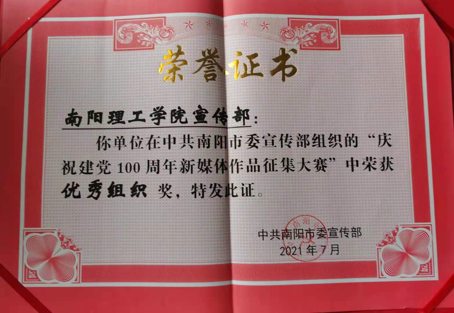 本网讯(记者/肖邓华) 8月5日下午,南阳市委宣传部庆祝建党100周年新媒体优秀作品颁奖仪式在南阳梅溪宾馆举行。我校报送的短视频《南阳理工学院庆祝建党100周年教职工合唱比赛》、MV《唱支山歌给党听》分别荣获二等奖,短视频《南阳理工学院庆祝中国共产党成立100周年文艺晚会》荣获优秀奖,我校荣获优秀组织奖。