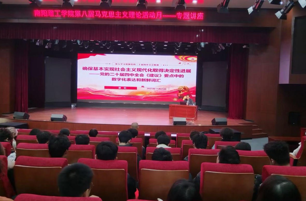 邵萌)11月25日,我校于东校区演播厅举办“第八届马克思主义理论活动月”专题讲座,党委宣传部部长逯忆作《确保基本实现社会主义现代化取得决定性进展——党的二十届四中全会< 建议>要点中的数字化表达和新鲜词汇》报告。马克思主义学院领导班子、教师及学生代表共同参加。