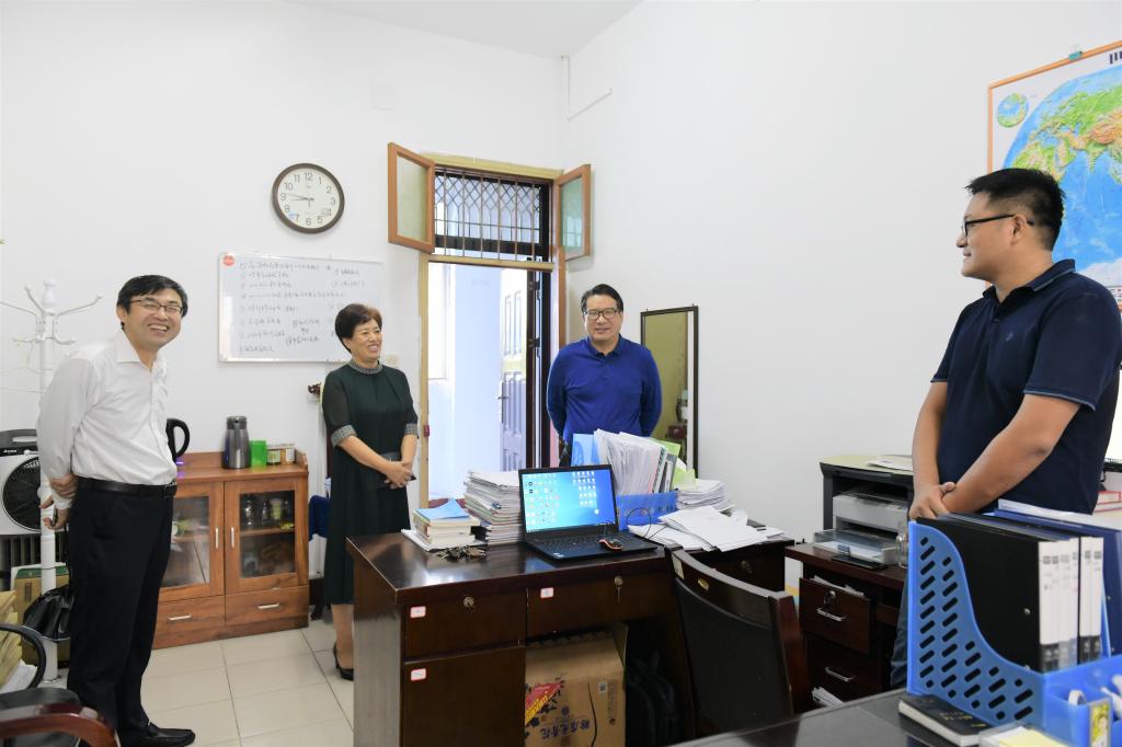 校领导一行到职能处室和教辅后勤单位查看新学期工作安排情况,了解教职工到岗情况,询问疫情防控情况;在外国语学院、范蠡商学院和计算机与软件学院了解线上教学及督导情况,并与今年获得国家基金项目的老师进行亲切交谈。刘荣英指出,各教学院领导班子要高度重视教学运行和疫情防控,把工作做精做细做实,确保新学期各项工作平稳有序。