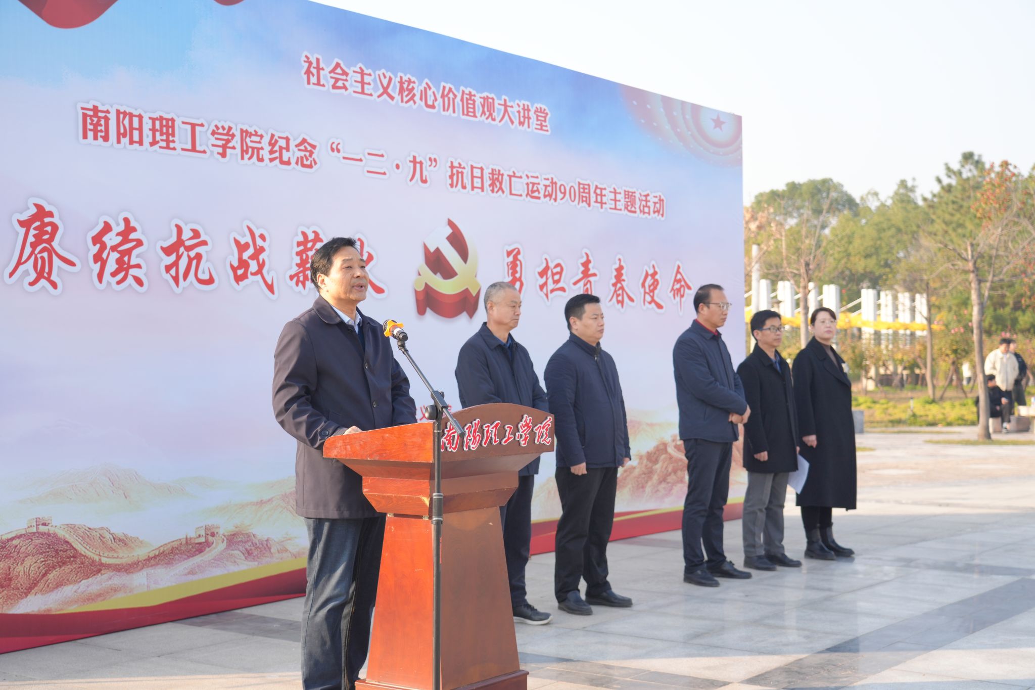 12月6日,南阳理工学院举办纪念“一二·九”抗日救亡运动90周年主题活动。校党委副书记、工会主席董豪作抗战精神宣讲,党委宣传部、团委、马克思主义学院负责人,部分思政课教师和2025级学生代表300余人参加活动。