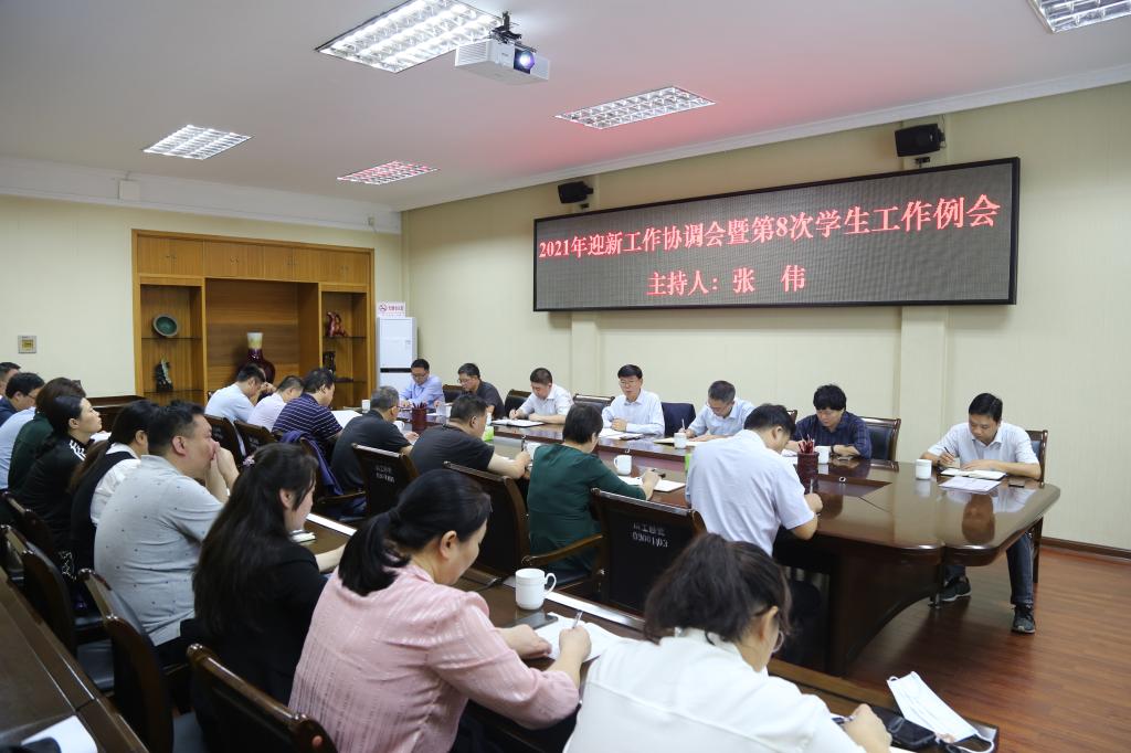 本网讯(特约记者/张启鑫)9月28日,校党委副书记、工会主席张伟主持召开我校2021年迎新工作协调会暨第8次学生工作例会,对2021年迎新工作、国庆假期前后学生管理、奖助学金评选等工作进行安排部署。党政办公室、党委宣传部、学生处、保卫处、后勤服务中心、校医院等单位主要负责人,各教学院党委副书记参加会议。