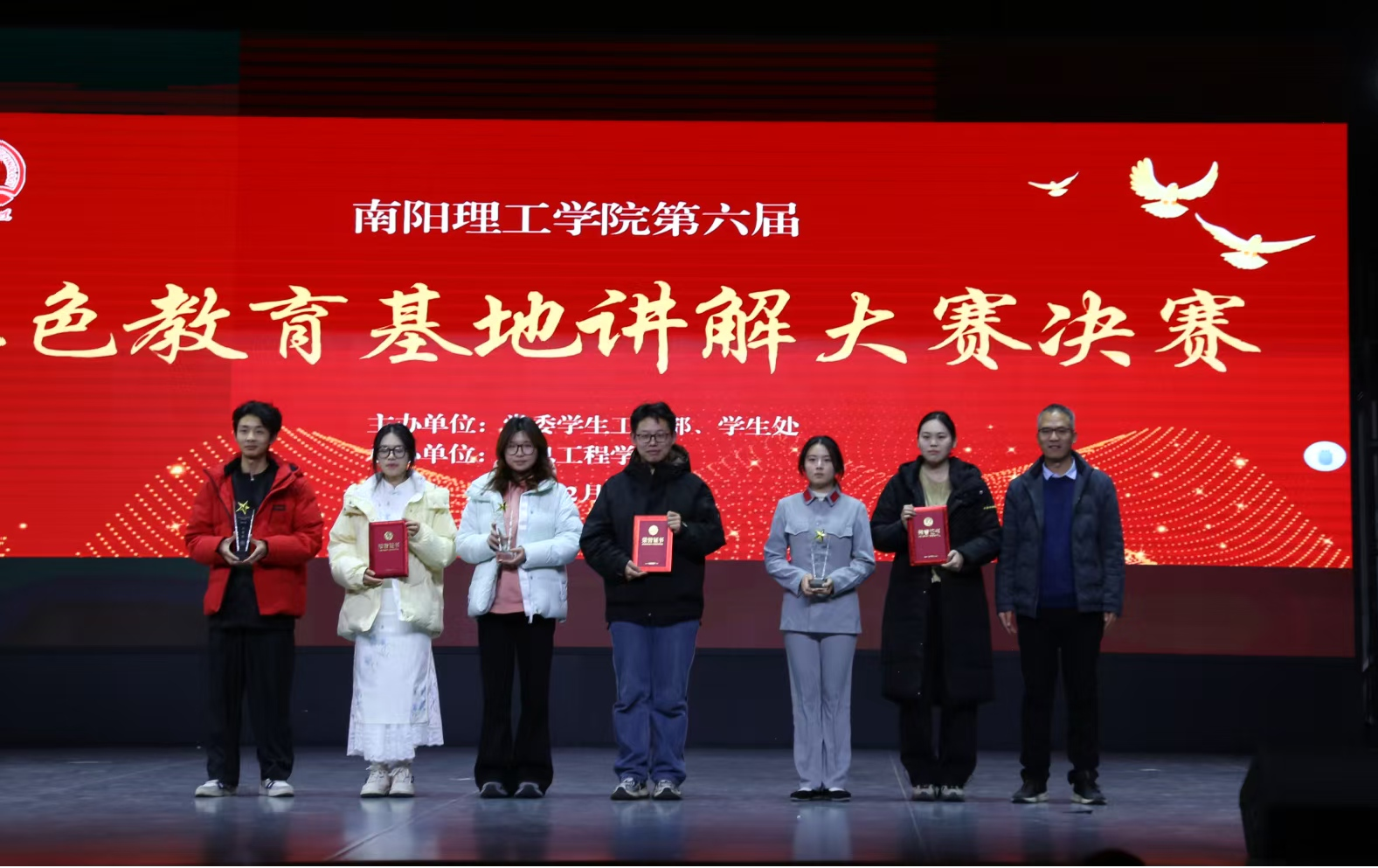 本网讯(特约记者/关阳)12月10日晚,南阳理工学院第六届红色教育基地讲解大赛决赛在学校毕业大厅举办。此次大赛由党委学生工作部主办,信息工程学院承办,党委组织部、党委宣传部、党委学生工作部、招生就业处等部门领导和各学院师生代表一同观看比赛。
