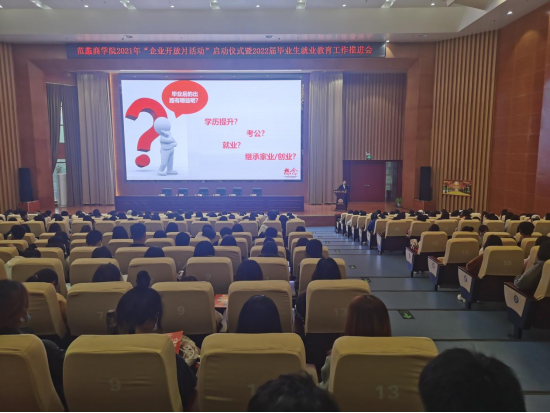 本网讯(通讯员/李晓茉 袁健)10月10日下午,范蠡商学院在第三报告厅举行2021年“企业开放月活动”启动仪式暨2022届毕业生就业教育工作推进大会。副校长葛晨光出席会议,想念食品股份有限公司人力资源部负责人及范蠡商学院师生代表参加会议,会议由范蠡商学院负责人主持。