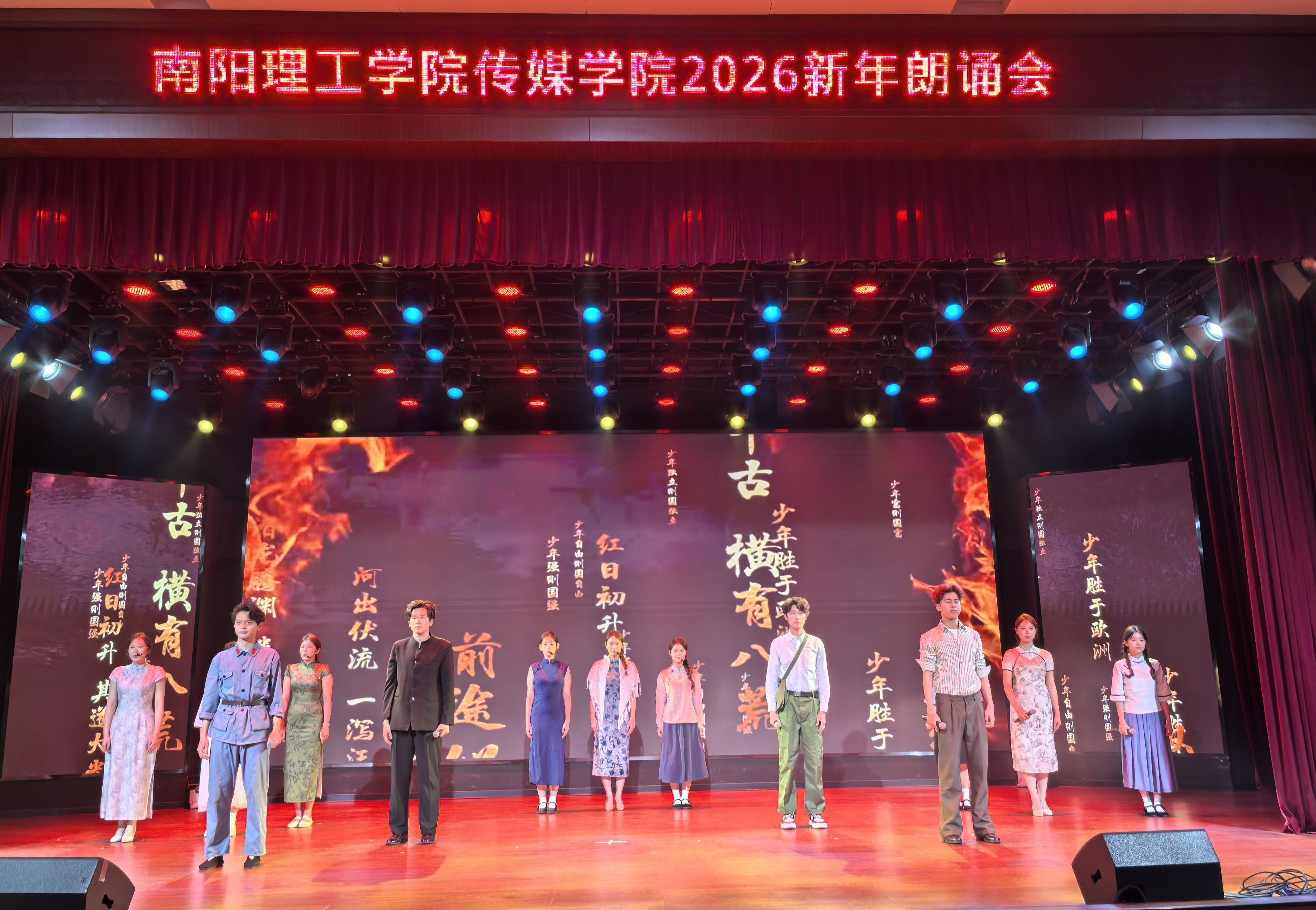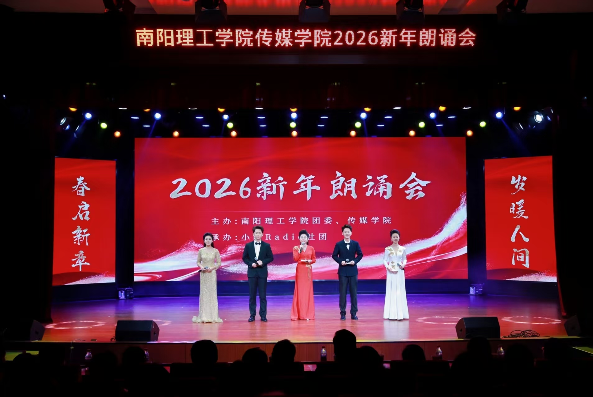 吴倩倩)12月23日晚,由南阳理工学院团委、传媒学院主办的“春启新章,岁暖人间”2026新年朗诵会在东校区演播厅举行。校党委副书记、工会主席董豪,副校长蔡广宇、高芳放,南阳广电传媒集团党委委员、副总经理贾恩方,南阳日报社政务新媒台台长王笑荷,南阳市图书馆副馆长杨艳以及校团委、传媒学院领导班子和师生欢聚一堂,以朗诵共迎新年。