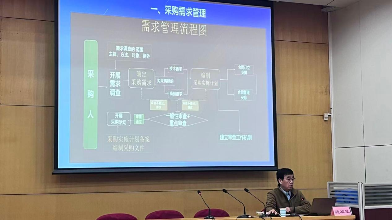陈国梁)12月25日下午,我校在中込会馆报告厅举办2025年度政府采购业务培训班,就采购工作规范实操——技术参数编制与评委评审要点等开展专题培训。学校评审专家库成员、各部门项目实施负责人及实验室主任等人员参加培训。