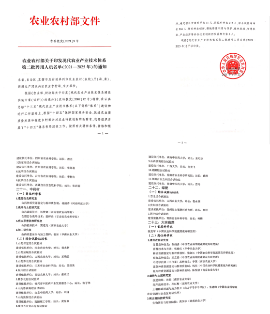 本网讯(特约记者/刘征 通讯员/牛晨慧 )近日,中华人民共和国农业部发布《农业农村部关于印发现代农业技术体系第二批聘用人员名单(2021--2025年)的通知》,我校黄显章教授被聘为国家中药材体系山药焦作综合试验站站长兼艾叶单品种攻关小组组长。