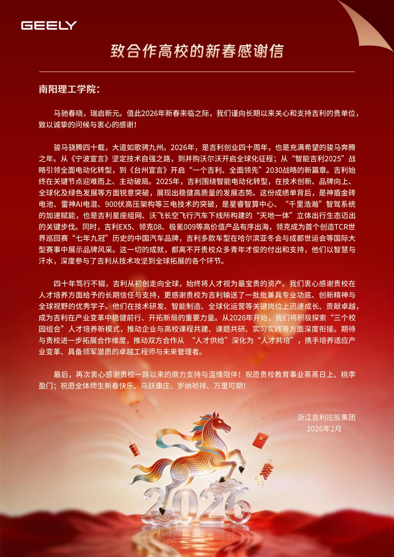 2026年,吉利集团向南阳理工学院发来感谢信