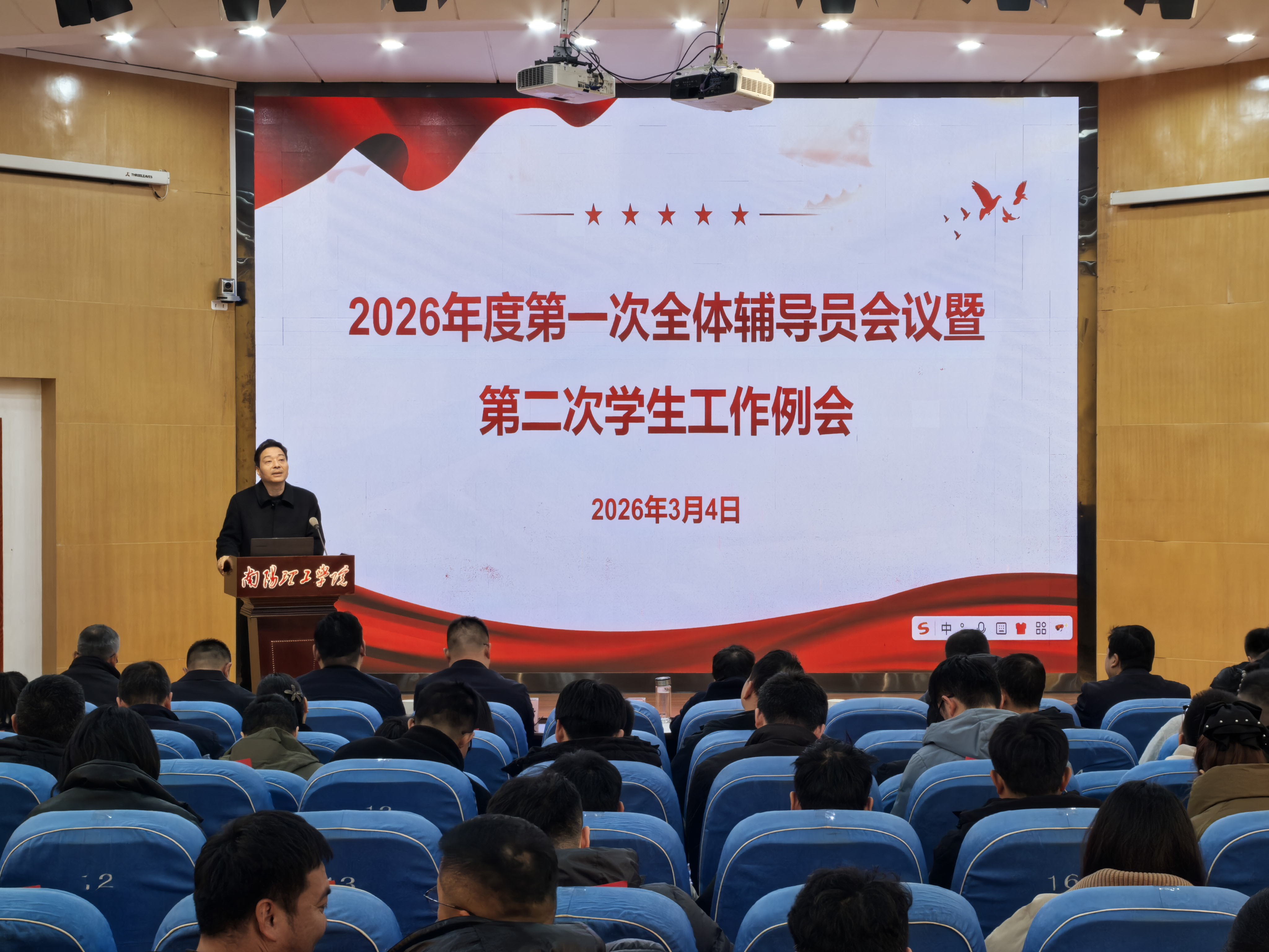 王吉春)3月4日上午,我校2026年度第一次全体辅导员会议暨第二次学生工作例会在第二学术报告厅召开。校党委副书记、工会主席董豪出席会议,学生处、团委、心理健康教育中心、保卫处、后勤服务中心、校医院、依法治校办公室等部门负责人,全体辅导员参加会议,会议由学生处负责人主持。