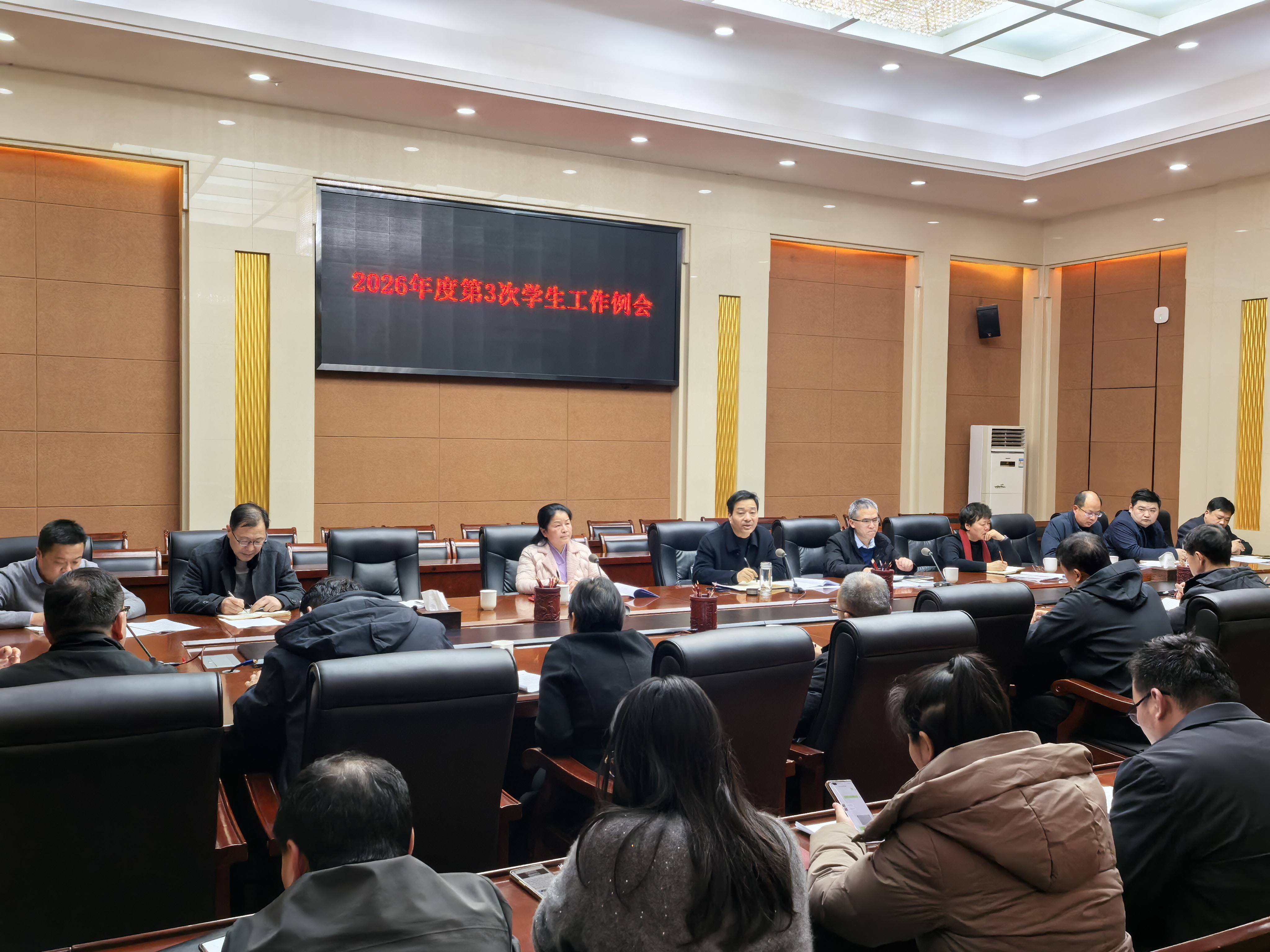王吉春)3月17日下午,校党委副书记、工会主席董豪主持召开我校2026年度第3次学生工作例会,学生处、团委、心理健康教育中心、保卫处、后勤服务中心、依法治校办公室、校医院等部门负责人,各教学院党委副书记、学工办主任参加会议。