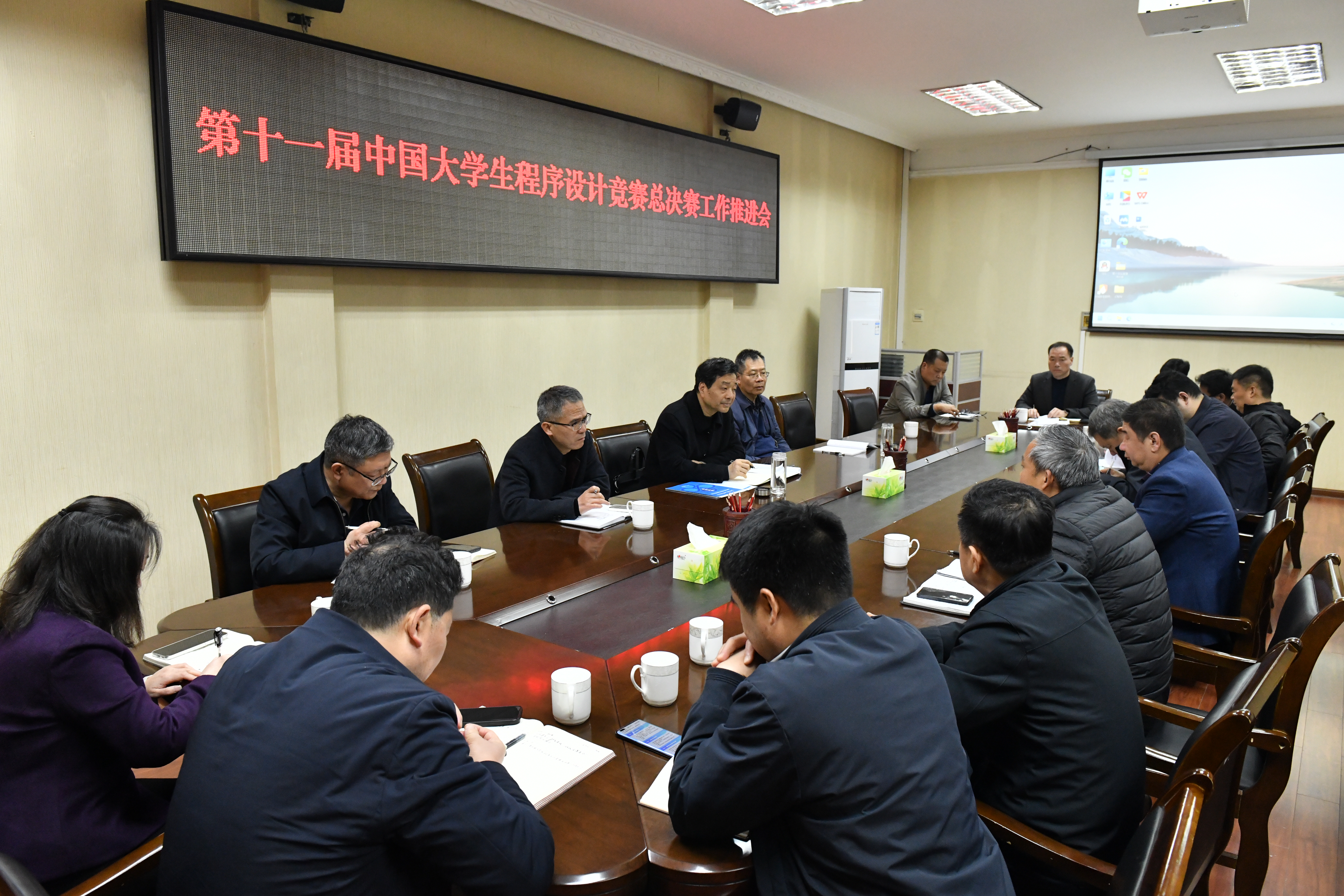 肖邓华) 4月1日上午,学校在第一会议室召开第十一届中国大学生程序设计竞赛总决赛工作推进会。校党委副书记、工会主席董豪,纪委书记、监察专员于继武出席会议,党政办公室、党委宣传部、统战部、财务处、学生处、招生就业处、保卫处、团委、后勤服务中心、数字媒体与艺术设计学院、教师教育学院、体育教学部、信息化建设与管理中心、计算机与软件学院等单位负责人参加会议。